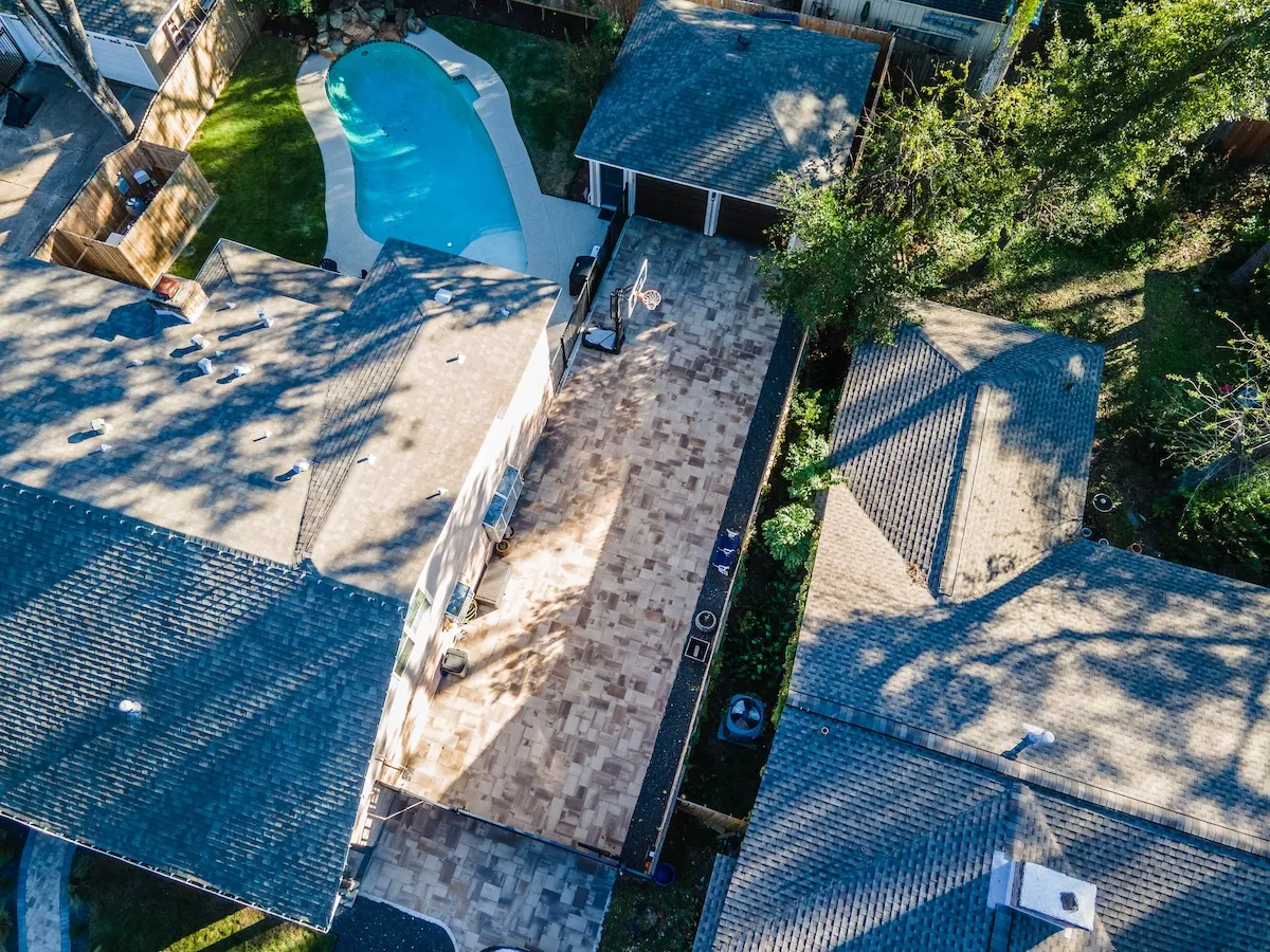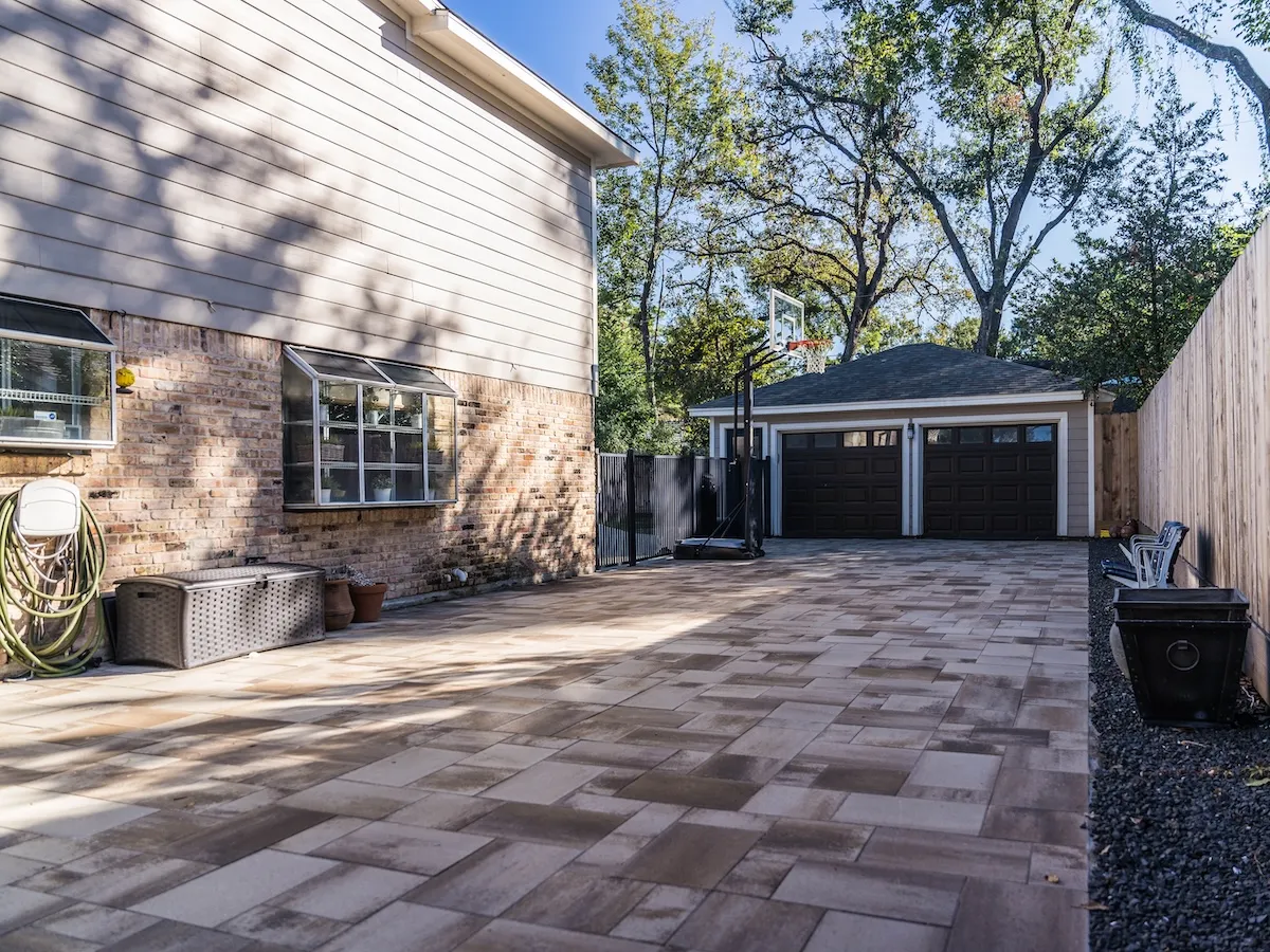 To bring this vision to life, we selected premium Belgard pavers known for their durability and aesthetic appeal. The perimeter of the project features the classic Holland Stone pavers, which create a striking border, while the main infill showcases the warm tones of beige Danville Dimension 12 pavers. This sophisticated combination spans the front walkway, the inviting porch area, and the extended driveway, covering an impressive total of around 3,200 square feet.