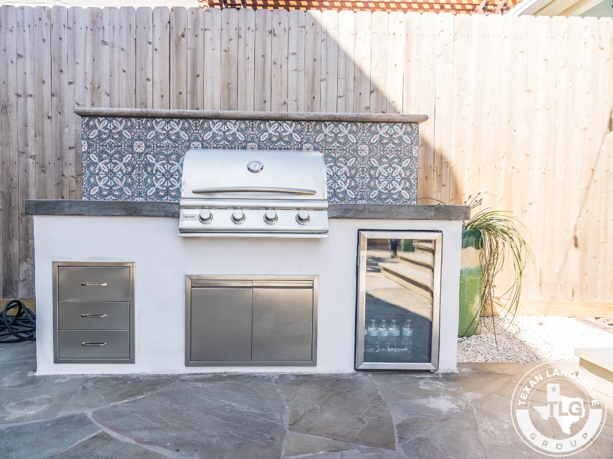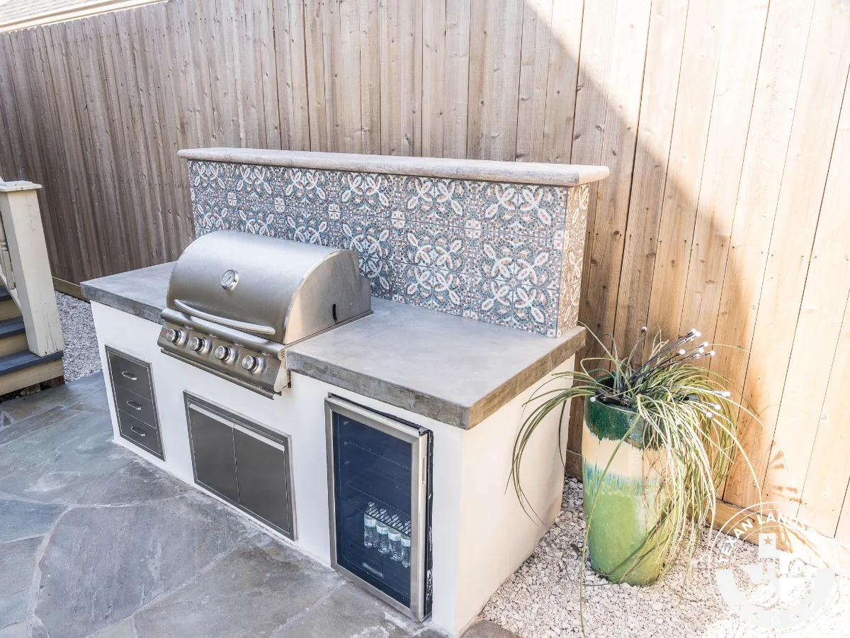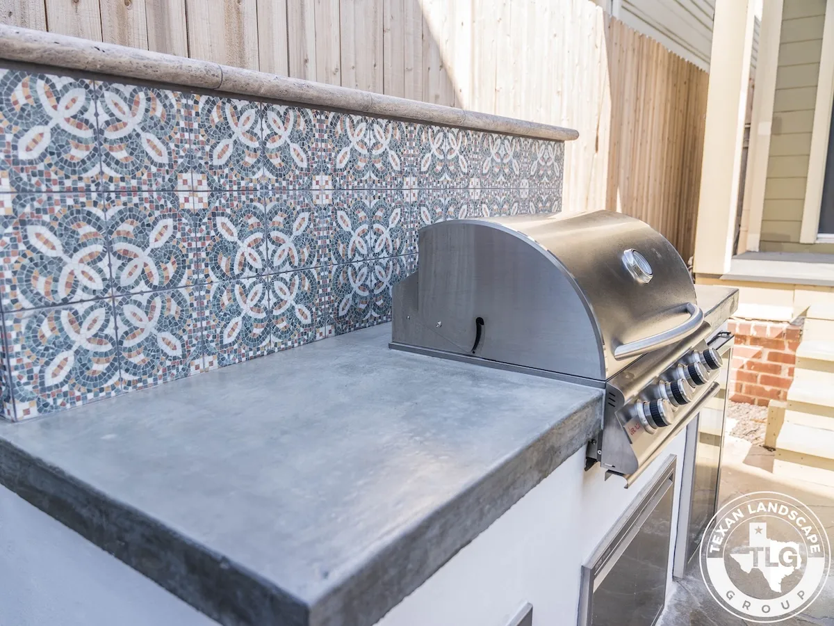 We revitalized the cluttered backyard with a limestone-filled flower bed featuring climate-friendly plants. We refinished the entire flagstone patio by thoroughly cleaning it and applying a matte sealer. A standout custom outdoor kitchen includes a polished concrete countertop, Spanish-style tile backsplash, and Blaze propane grill—perfect for entertaining.