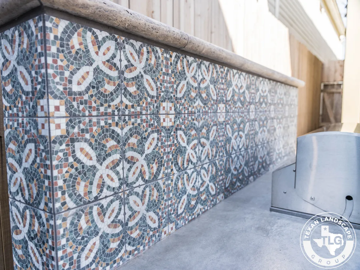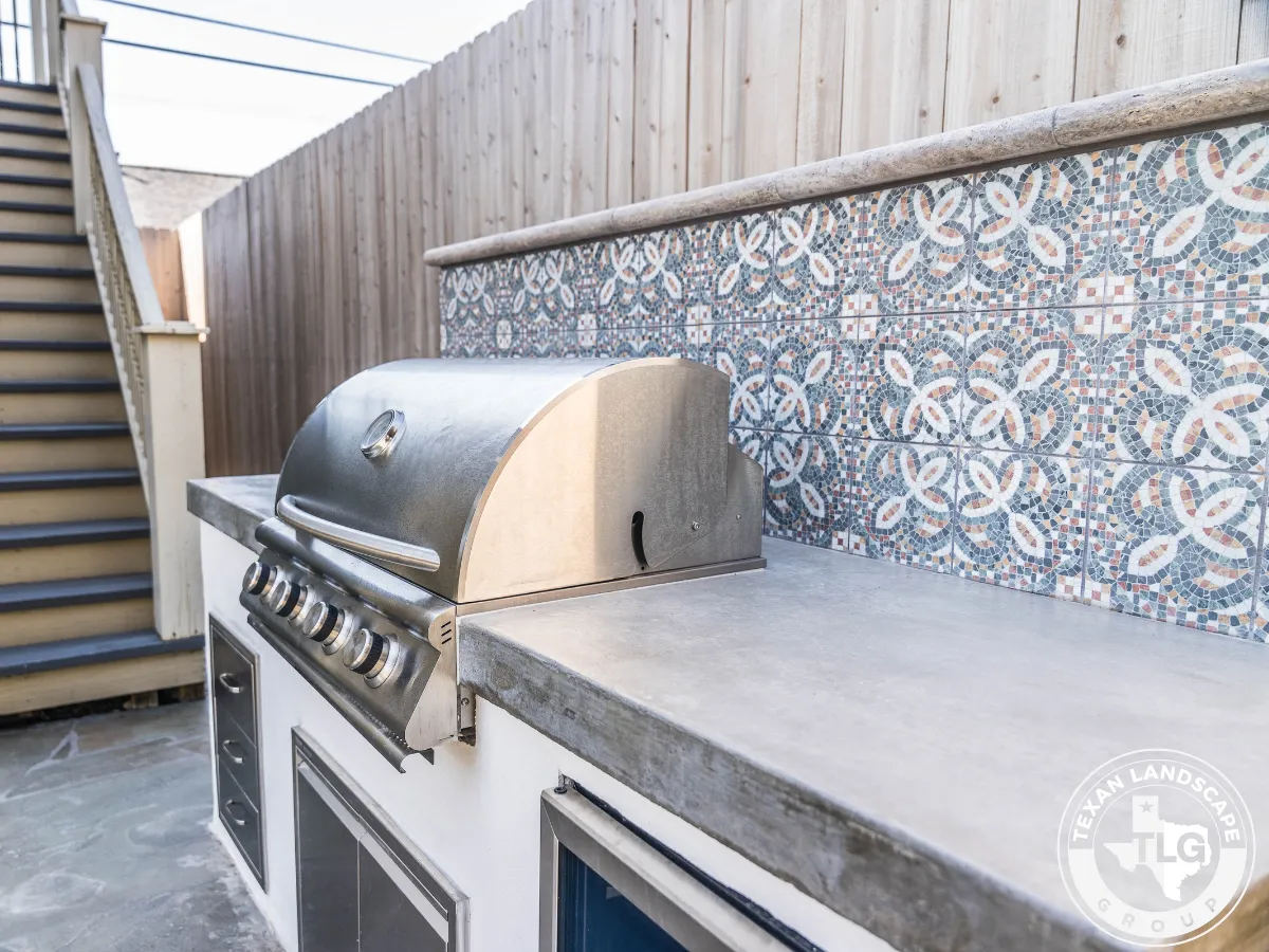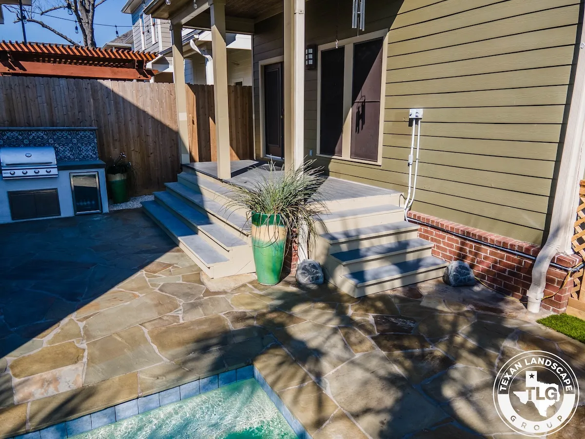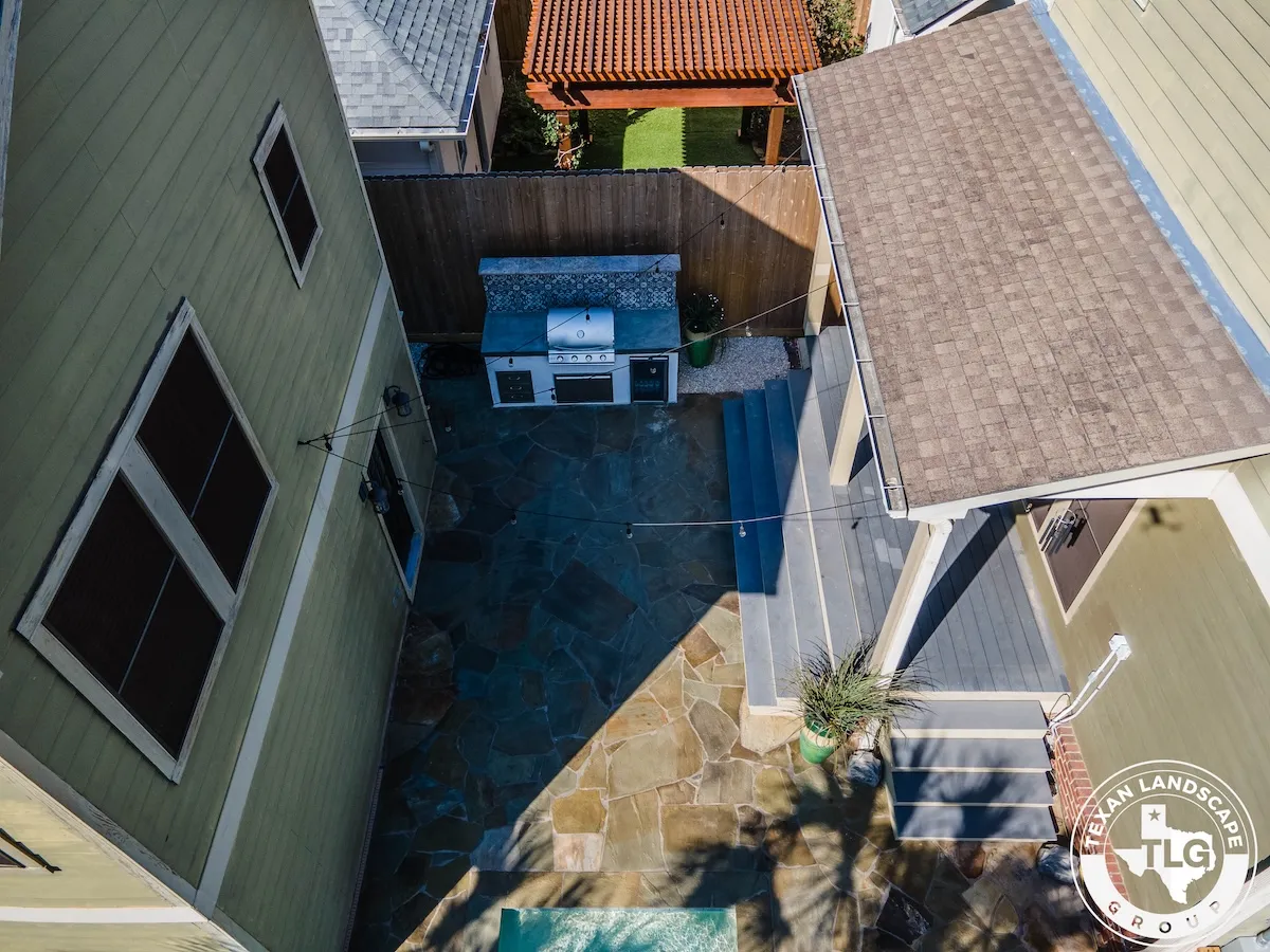 We revitalized the cluttered backyard with a limestone-filled flower bed featuring climate-friendly plants. We refinished the entire flagstone patio by thoroughly cleaning it and applying a matte sealer. A standout custom outdoor kitchen includes a polished concrete countertop, Spanish-style tile backsplash, and Blaze propane grill—perfect for entertaining.