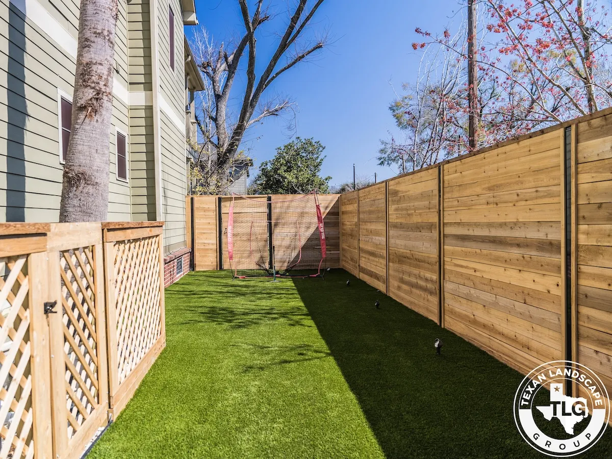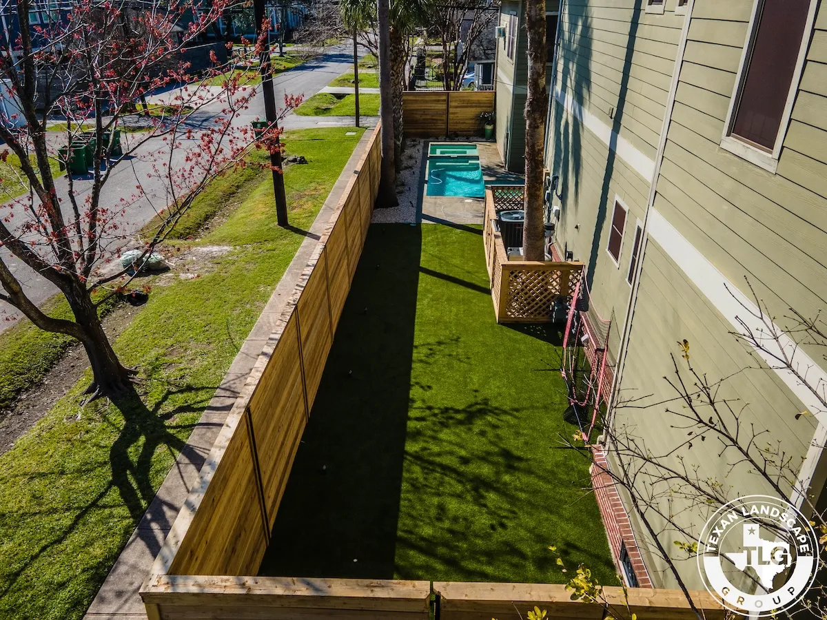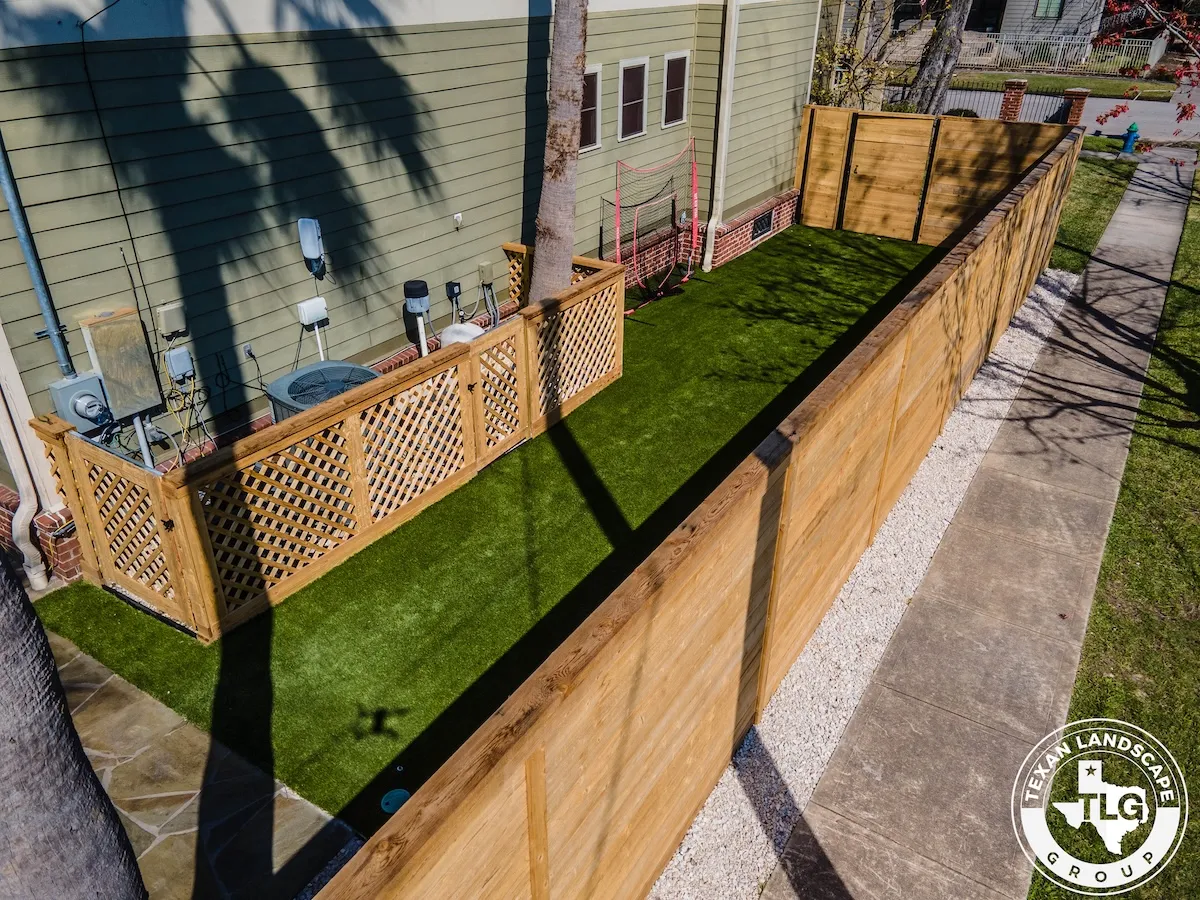 Nestled in Houston’s Heights neighborhood, this backyard transformation by Texas Landscape Group blends privacy, functionality, and style. A new horizontal cedar fence replaces the old rod iron barrier, adding warmth and character while maintaining structural integrity.