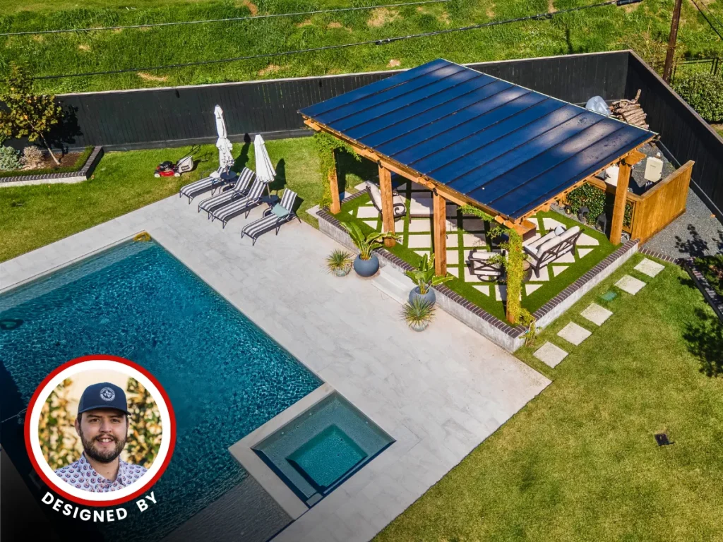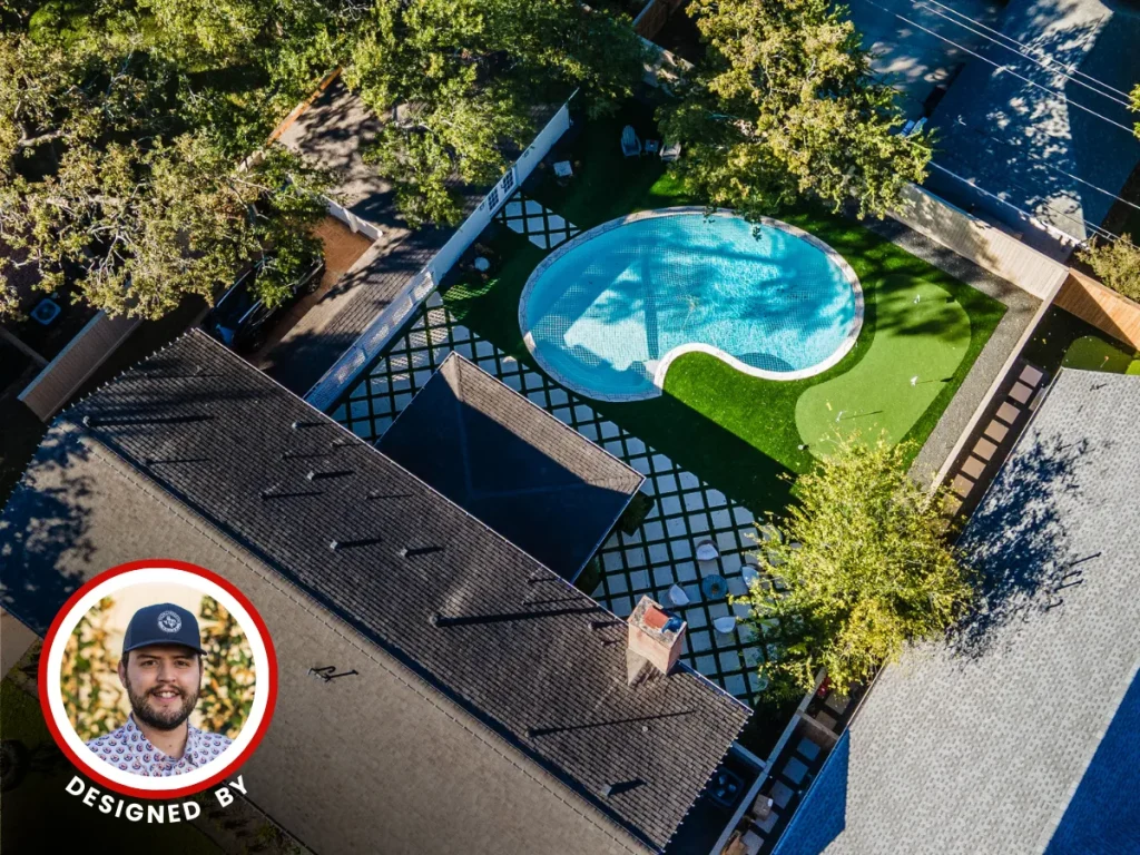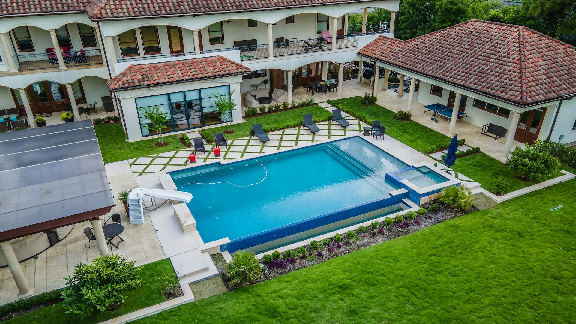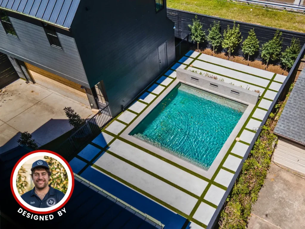 Details: Custom landscape with artificial turf, pavers, & cowboy pool