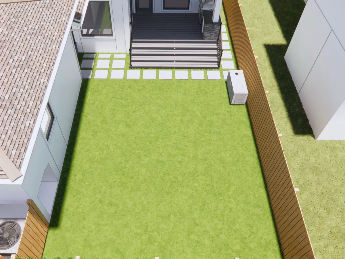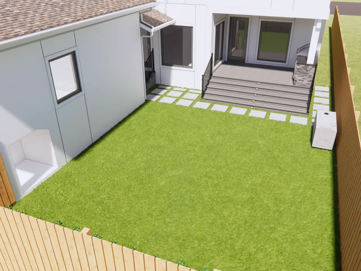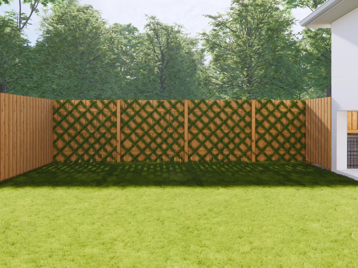 In the backyard, we preserved and expanded the artificial turf area, creating more open room for kids to play while allowing parents to relax nearby on lounge chairs. To bring vertical interest and life to the fence line, we installed diamond-pattern trellises along both the side and rear fences and planted honeysuckle vines, which will gradually green the entire perimeter as they mature.