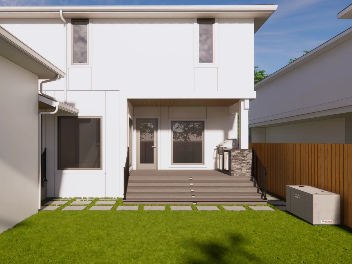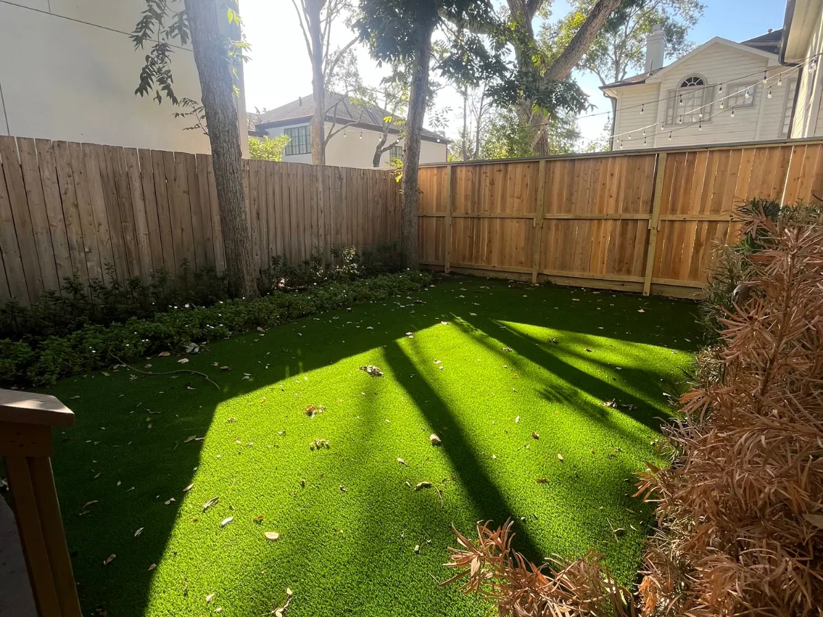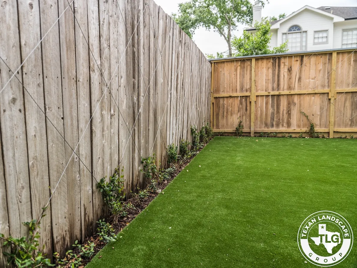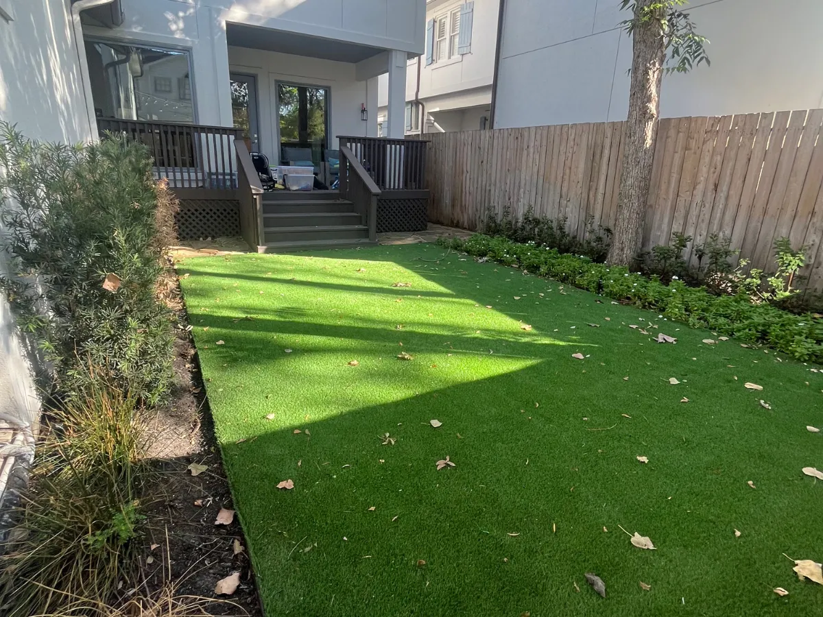 In the backyard, we preserved and expanded the artificial turf area, creating more open room for kids to play while allowing parents to relax nearby on lounge chairs. To bring vertical interest and life to the fence line, we installed diamond-pattern trellises along both the side and rear fences and planted honeysuckle vines, which will gradually green the entire perimeter as they mature.