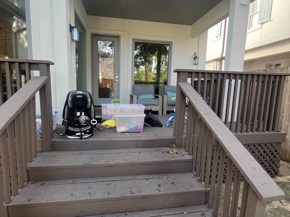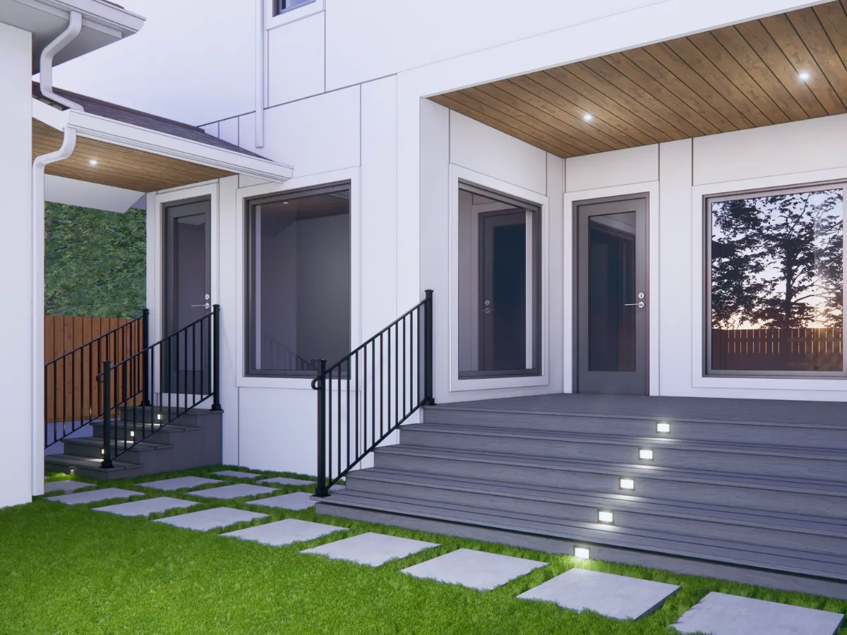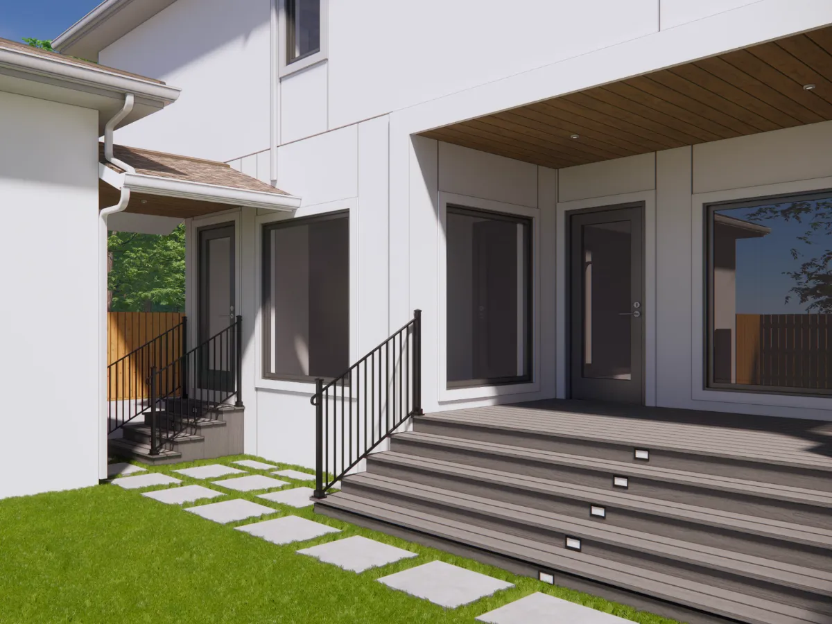 We began by redesigning the staircase and entry transitions, replacing the old deck with a cascading stair layout that gently opens onto the backyard. We also installed custom railings that offered both safety and a more refined visual feel. We replaced outdated flagstone and decomposed granite with our signature 2×2 pearl cast stone pavers, forming a smooth, modern walkway that now includes a cozy nook for morning coffee or evening lounging.