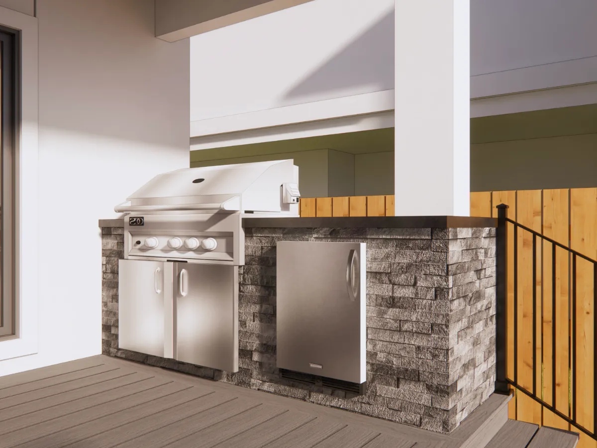 A major feature of the renovation is the clean-lined outdoor kitchen, tucked seamlessly into the design as if it’s always been part of the home. It includes a built-in grill, storage cabinets, and a polished concrete countertop—offering just the right mix of function and simplicity.