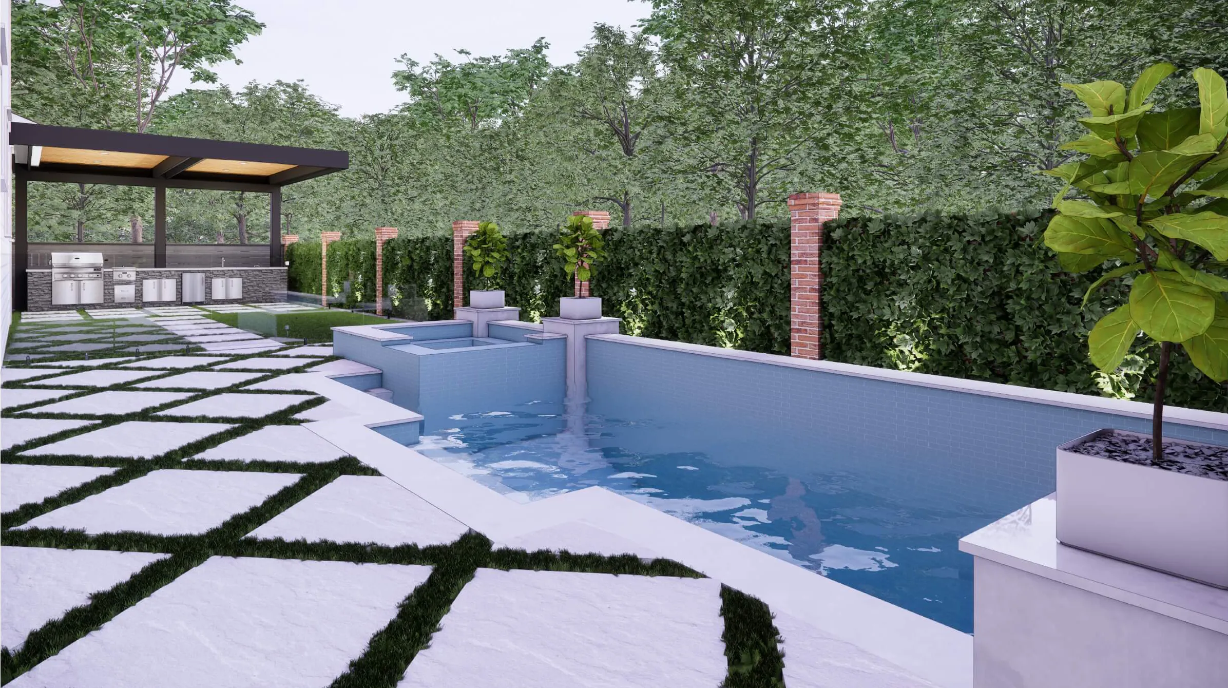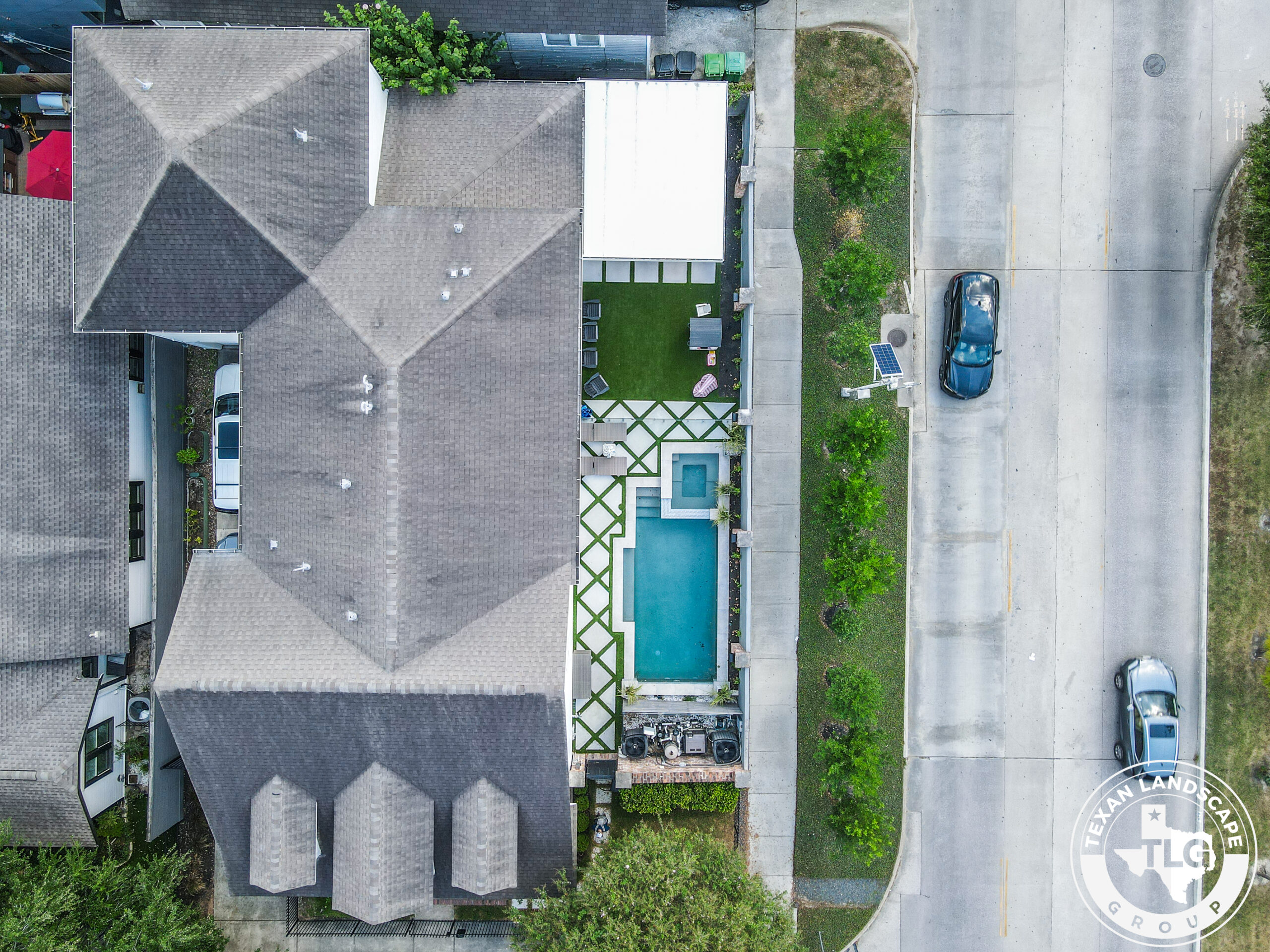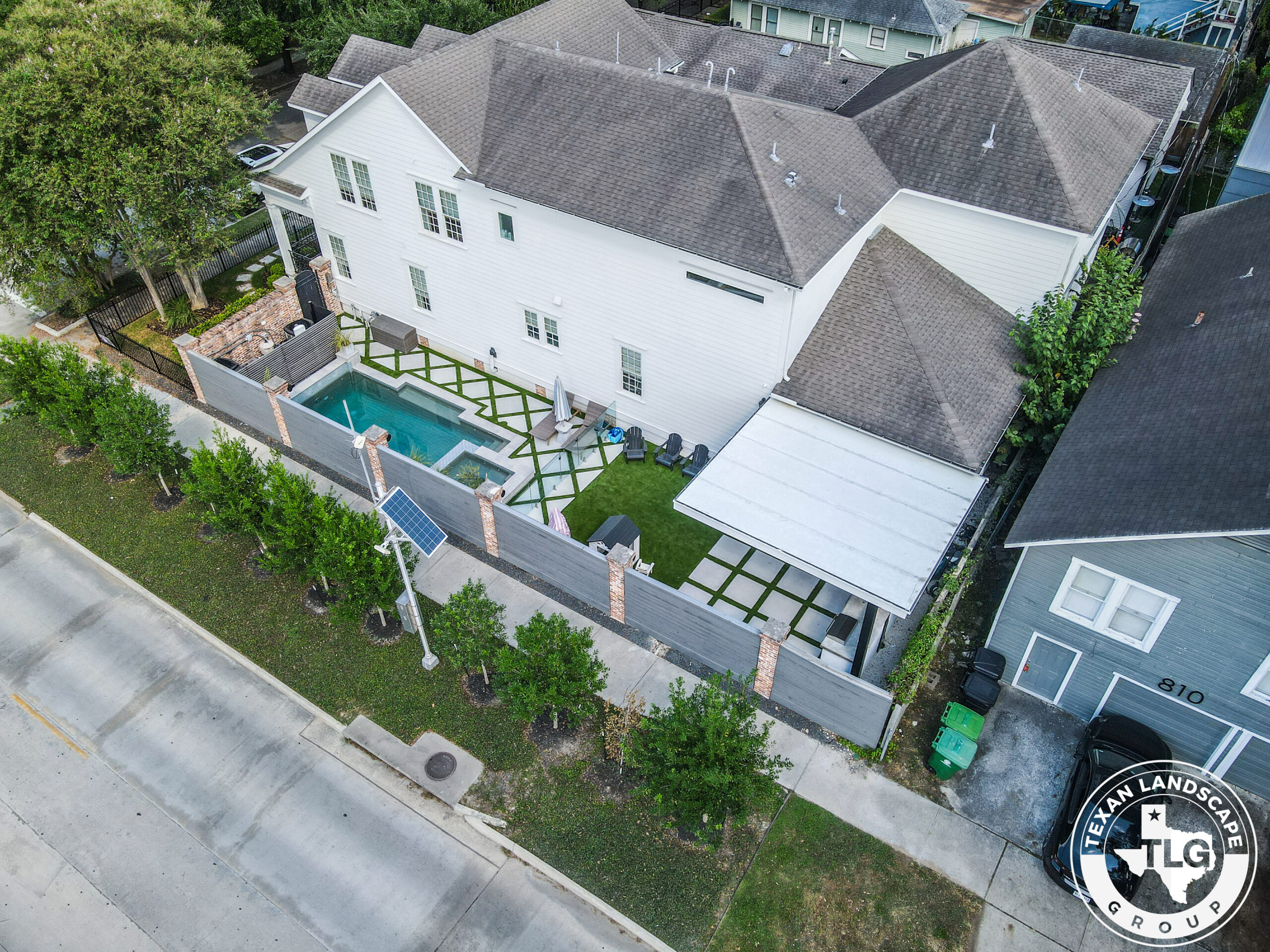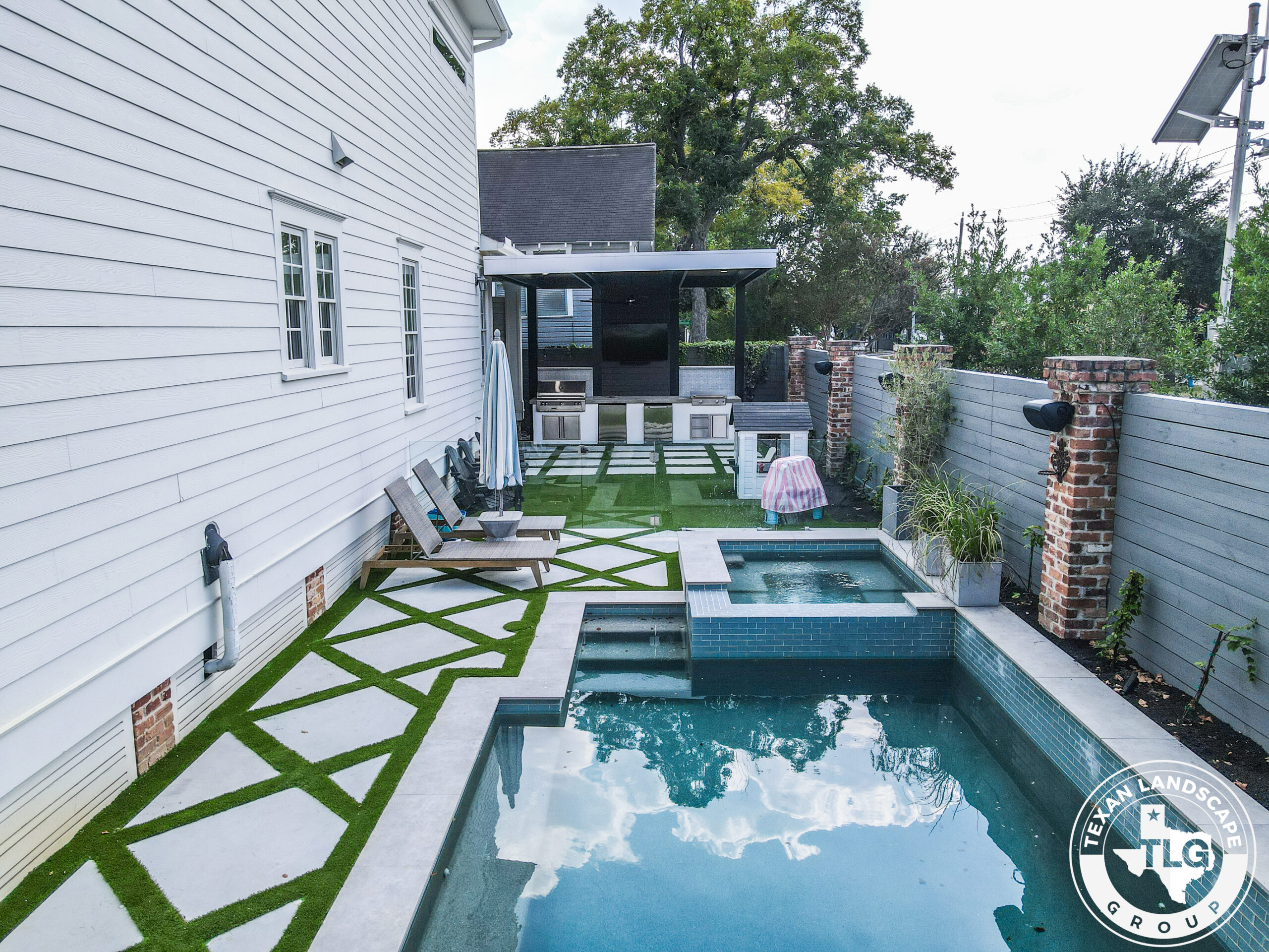 This backyard transformation in the Heights, Houston, focused on creating a cohesive, functional space around the existing pool while complementing the home’s contemporary style. The original layout felt disjointed with oversized pavers, a pergola, and a fireplace that lacked flow. Our redesign opened the yard, added a covered entertainment area, and introduced a dedicated play zone for the kids.