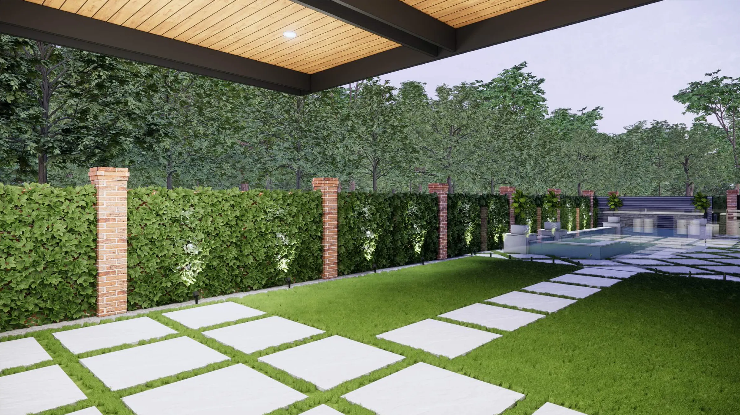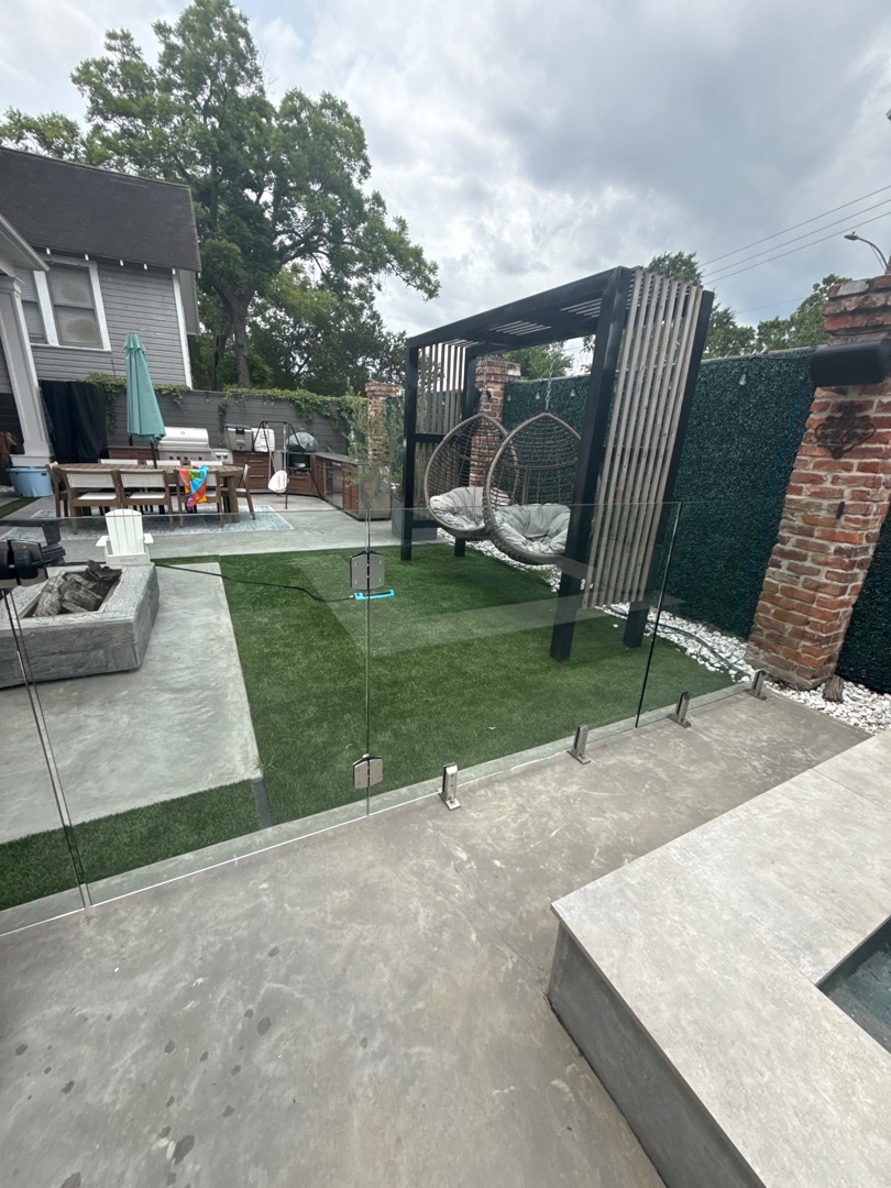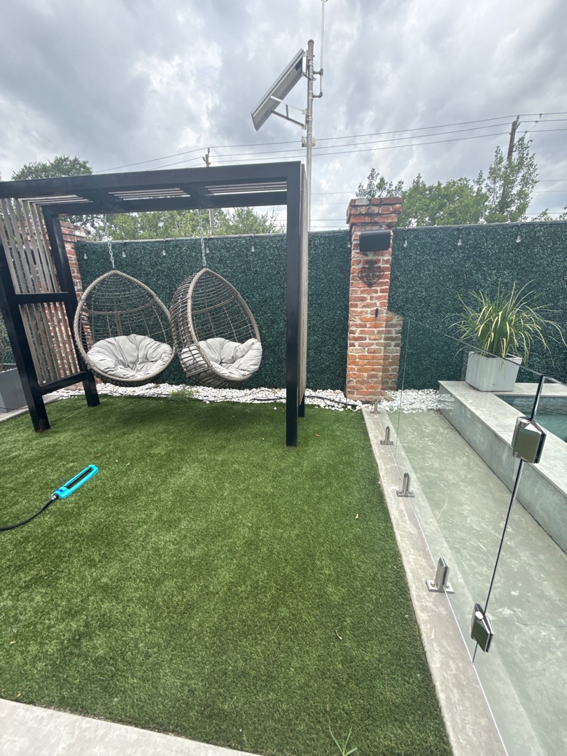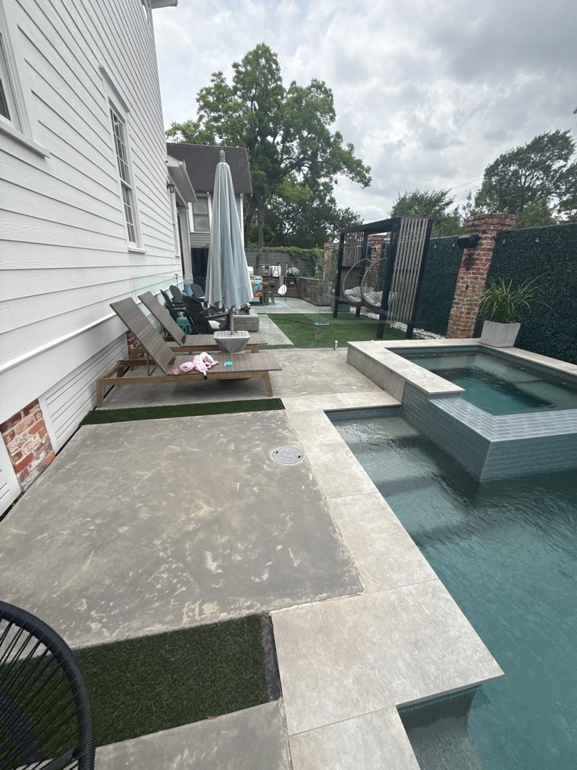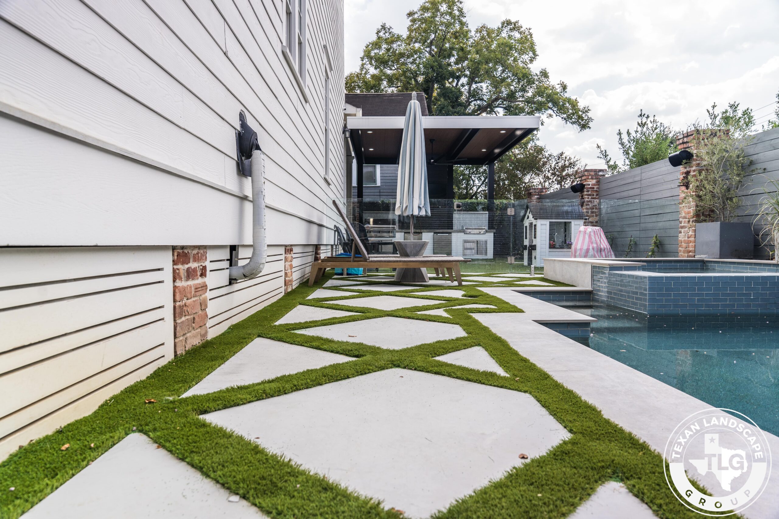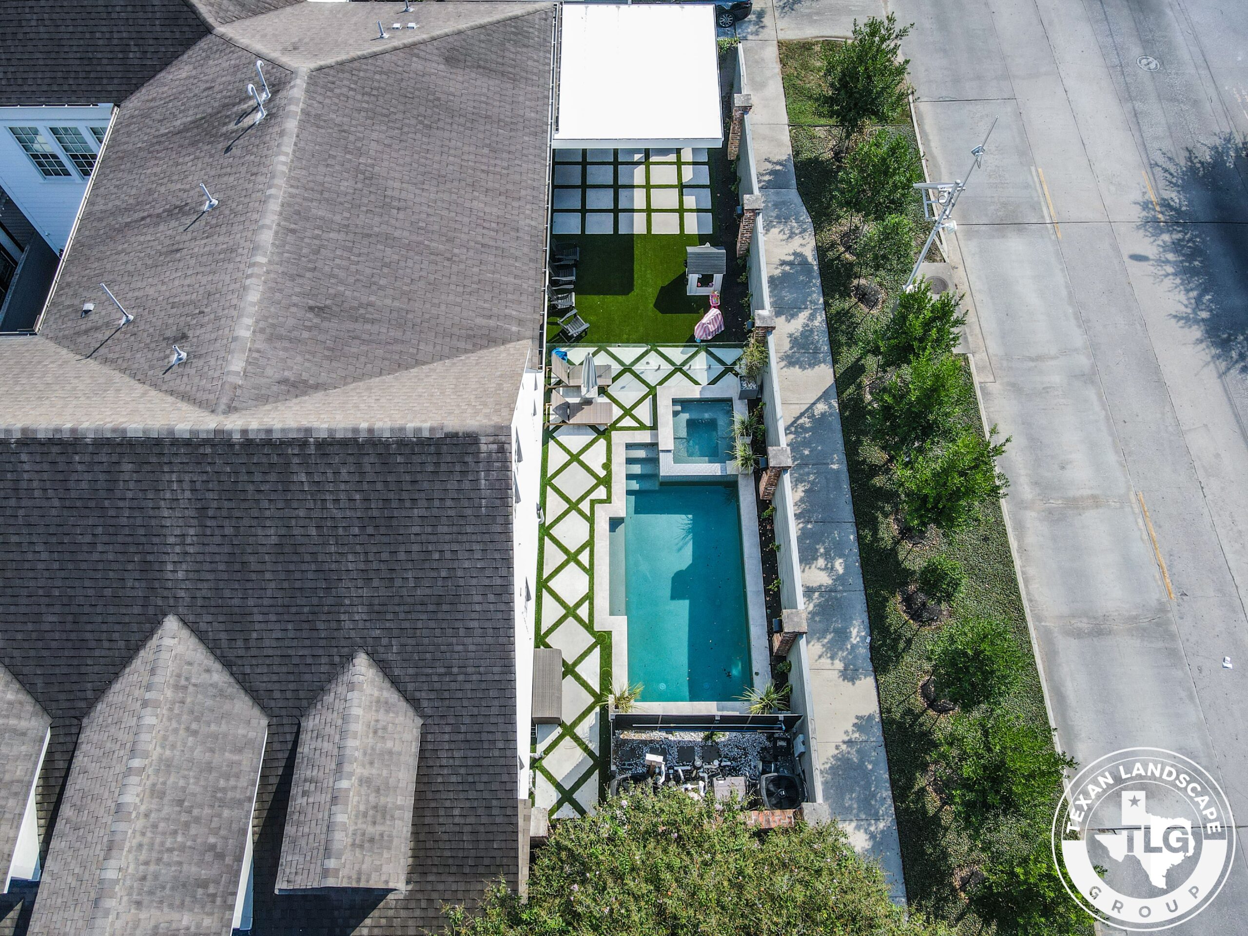 This backyard transformation in the Heights, Houston, focused on creating a cohesive, functional space around the existing pool while complementing the home’s contemporary style. The original layout felt disjointed with oversized pavers, a pergola, and a fireplace that lacked flow. Our redesign opened the yard, added a covered entertainment area, and introduced a dedicated play zone for the kids.