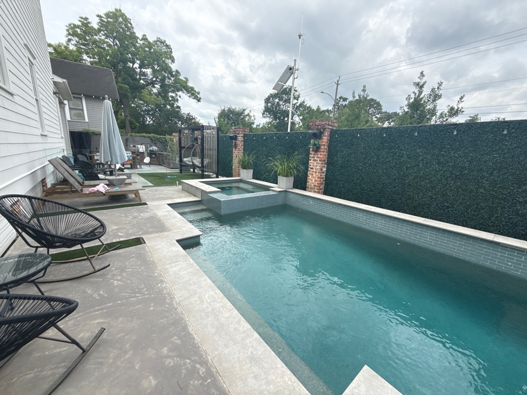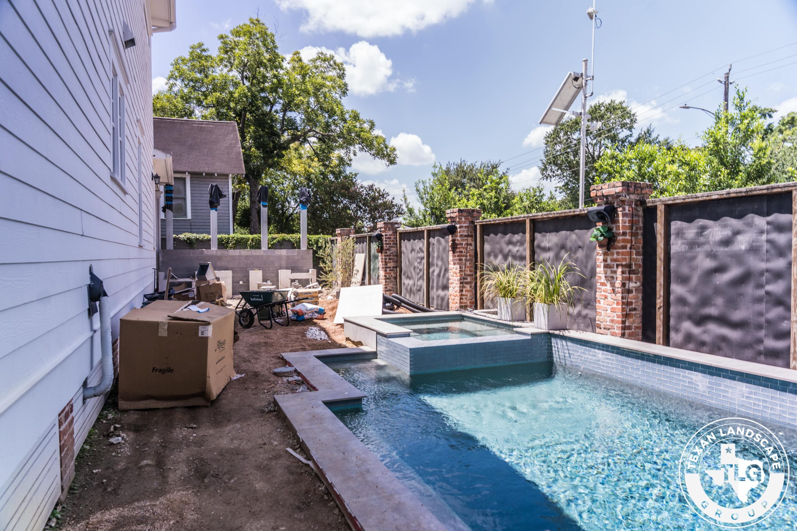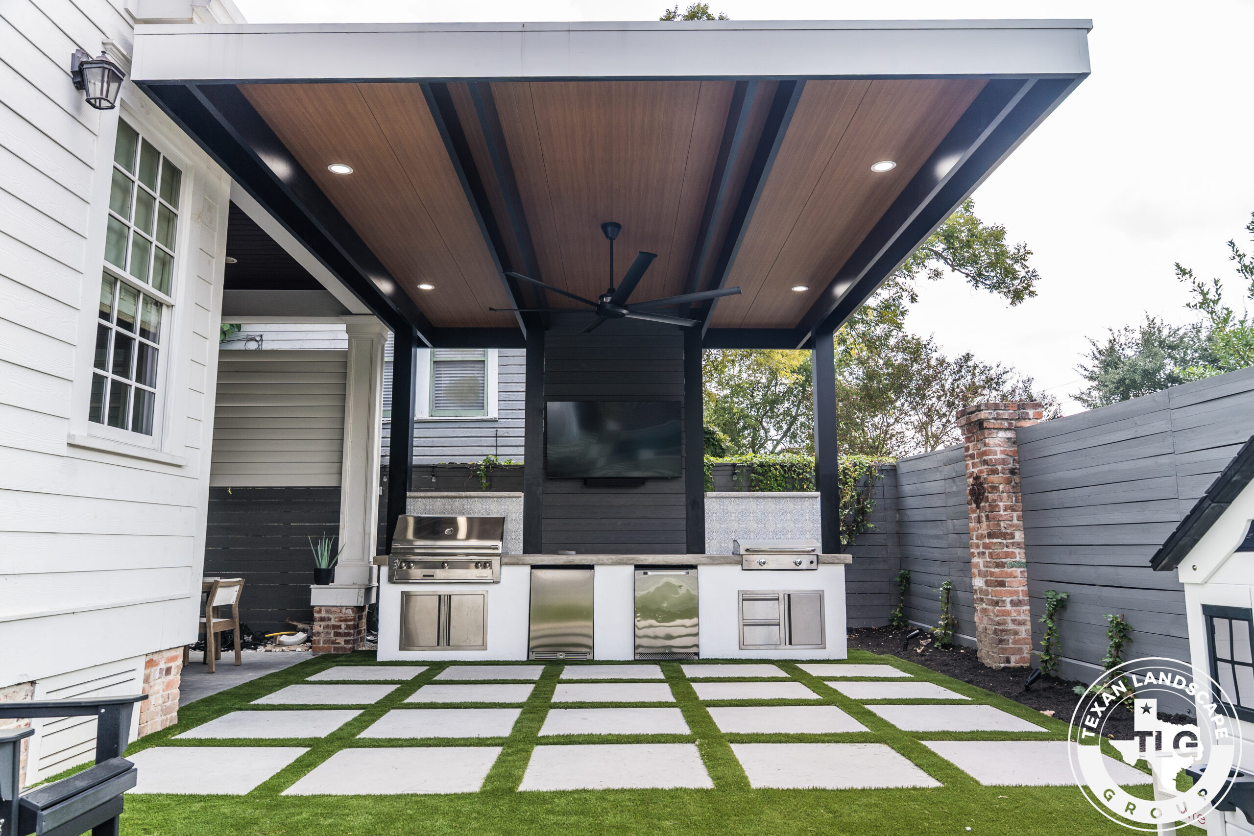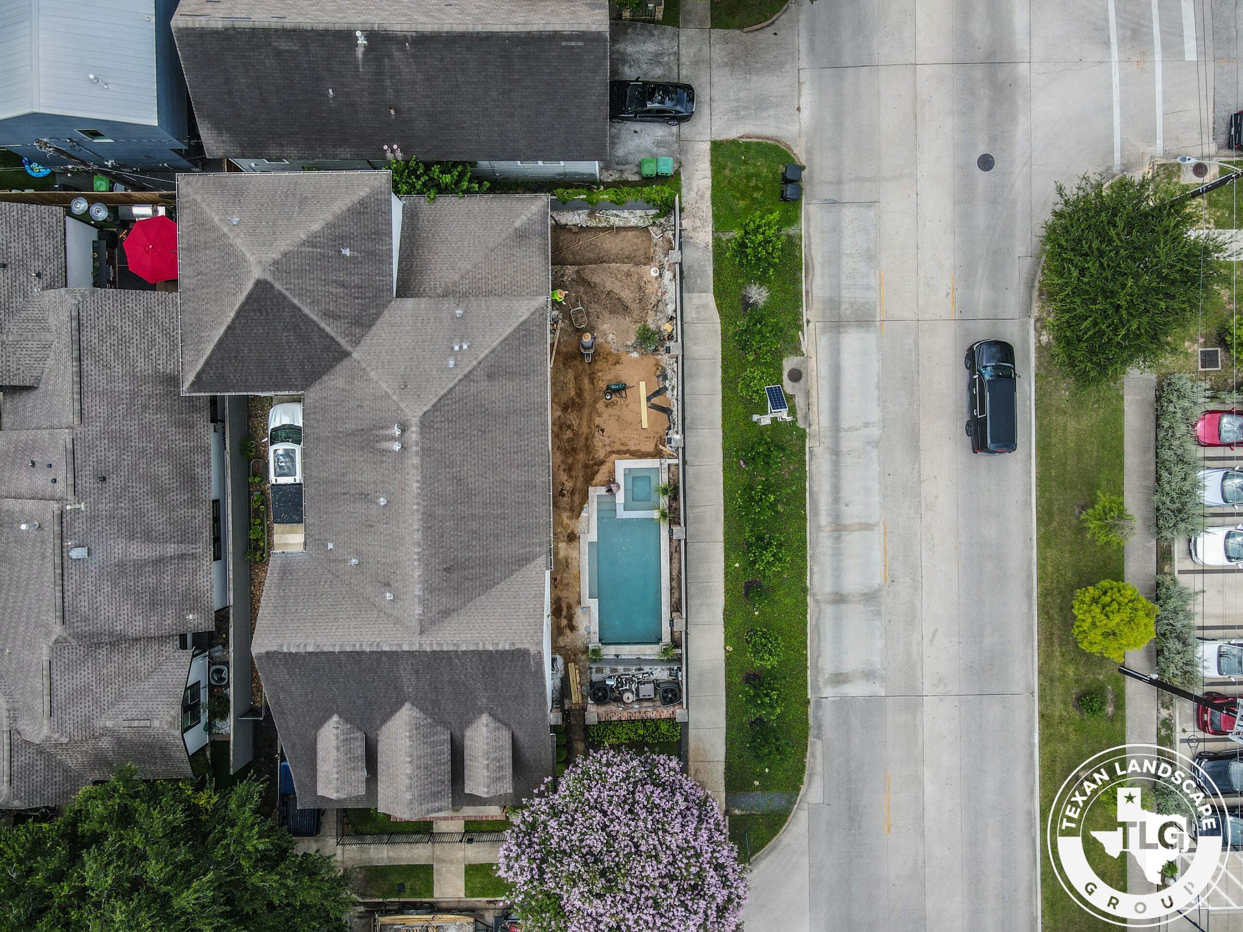 This backyard transformation in the Heights, Houston, focused on creating a cohesive, functional space around the existing pool while complementing the home’s contemporary style. The original layout felt disjointed with oversized pavers, a pergola, and a fireplace that lacked flow. Our redesign opened the yard, added a covered entertainment area, and introduced a dedicated play zone for the kids.