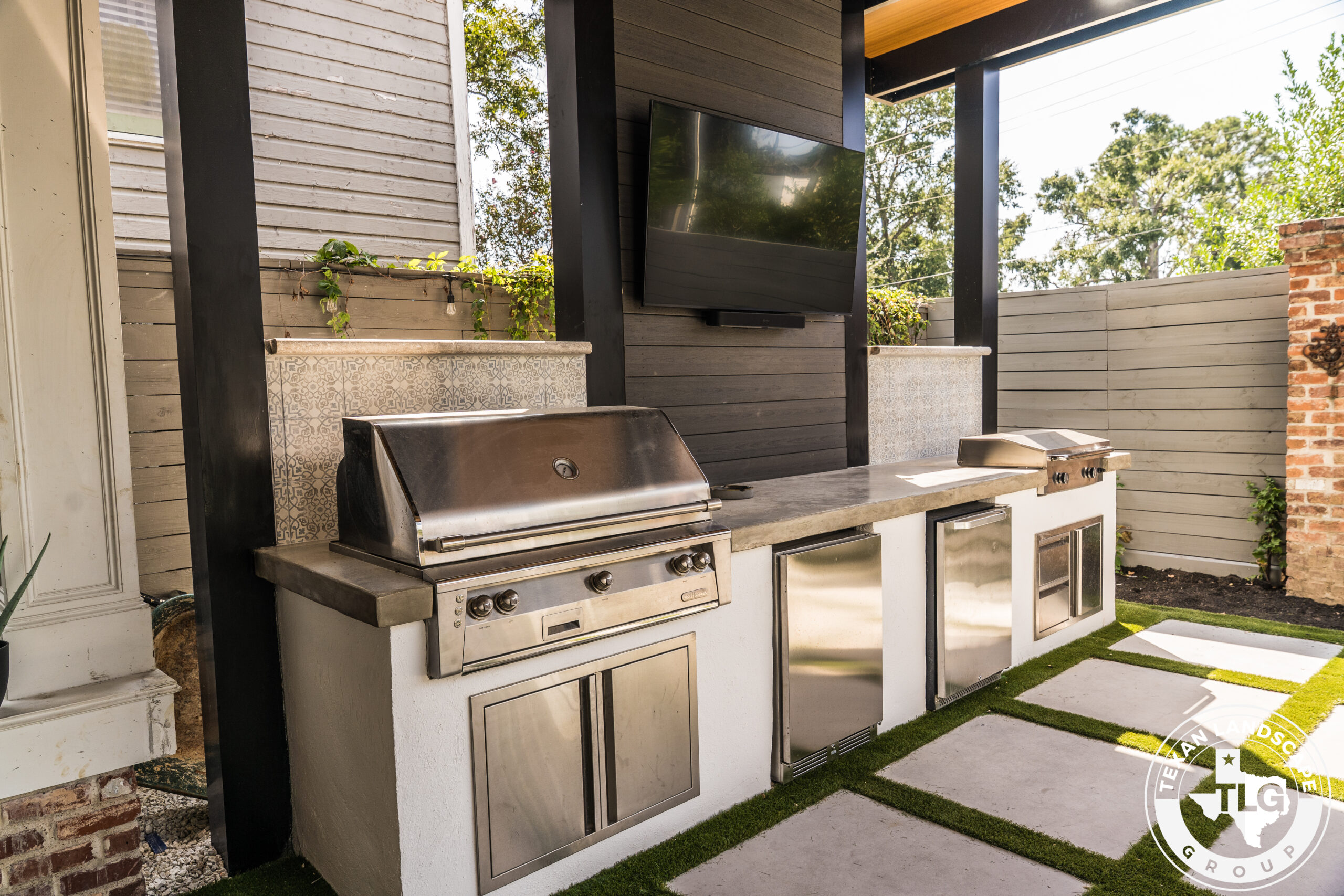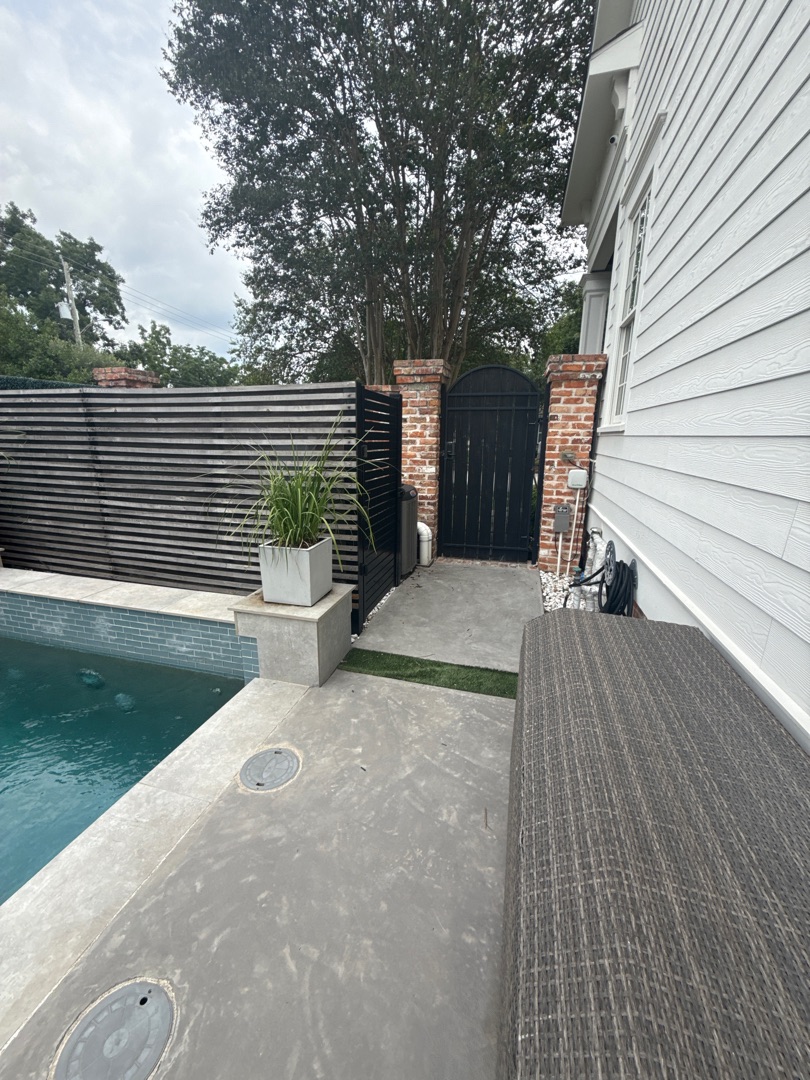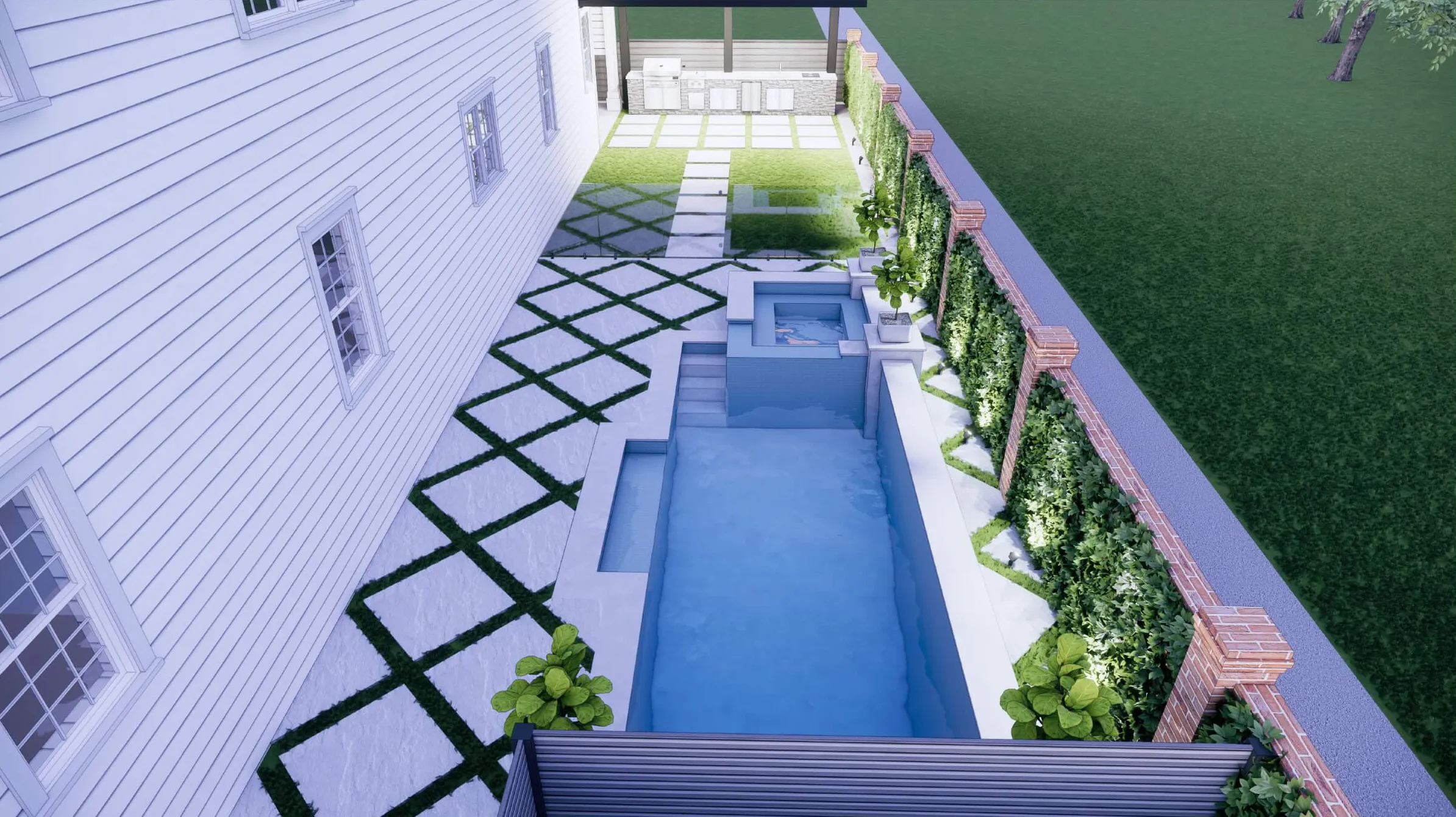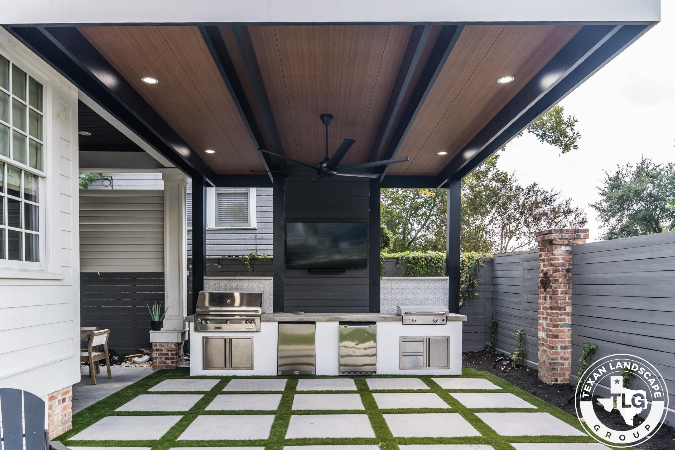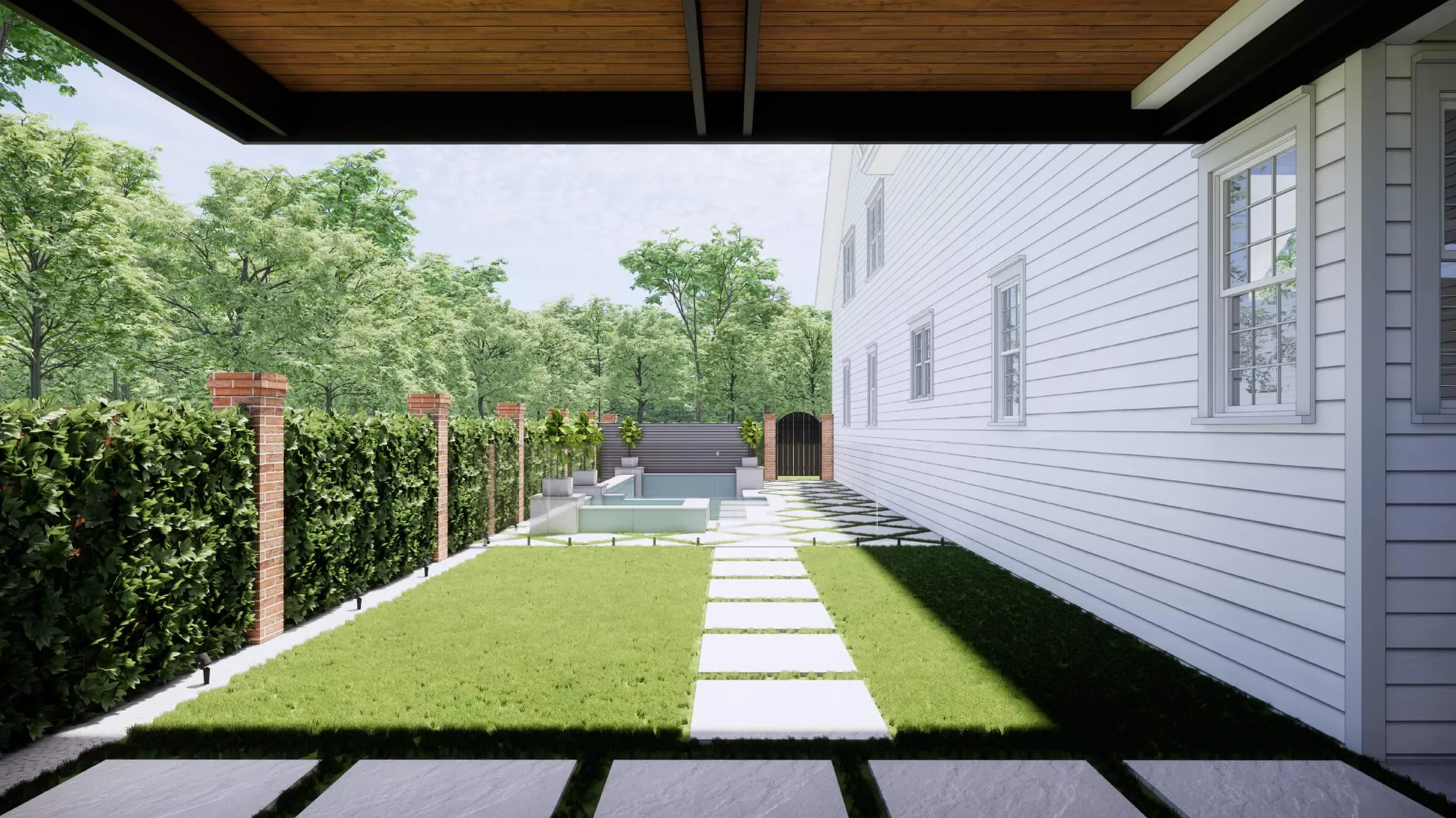 This backyard transformation in the Heights, Houston, focused on creating a cohesive, functional space around the existing pool while complementing the home’s contemporary style. The original layout felt disjointed with oversized pavers, a pergola, and a fireplace that lacked flow. Our redesign opened the yard, added a covered entertainment area, and introduced a dedicated play zone for the kids.