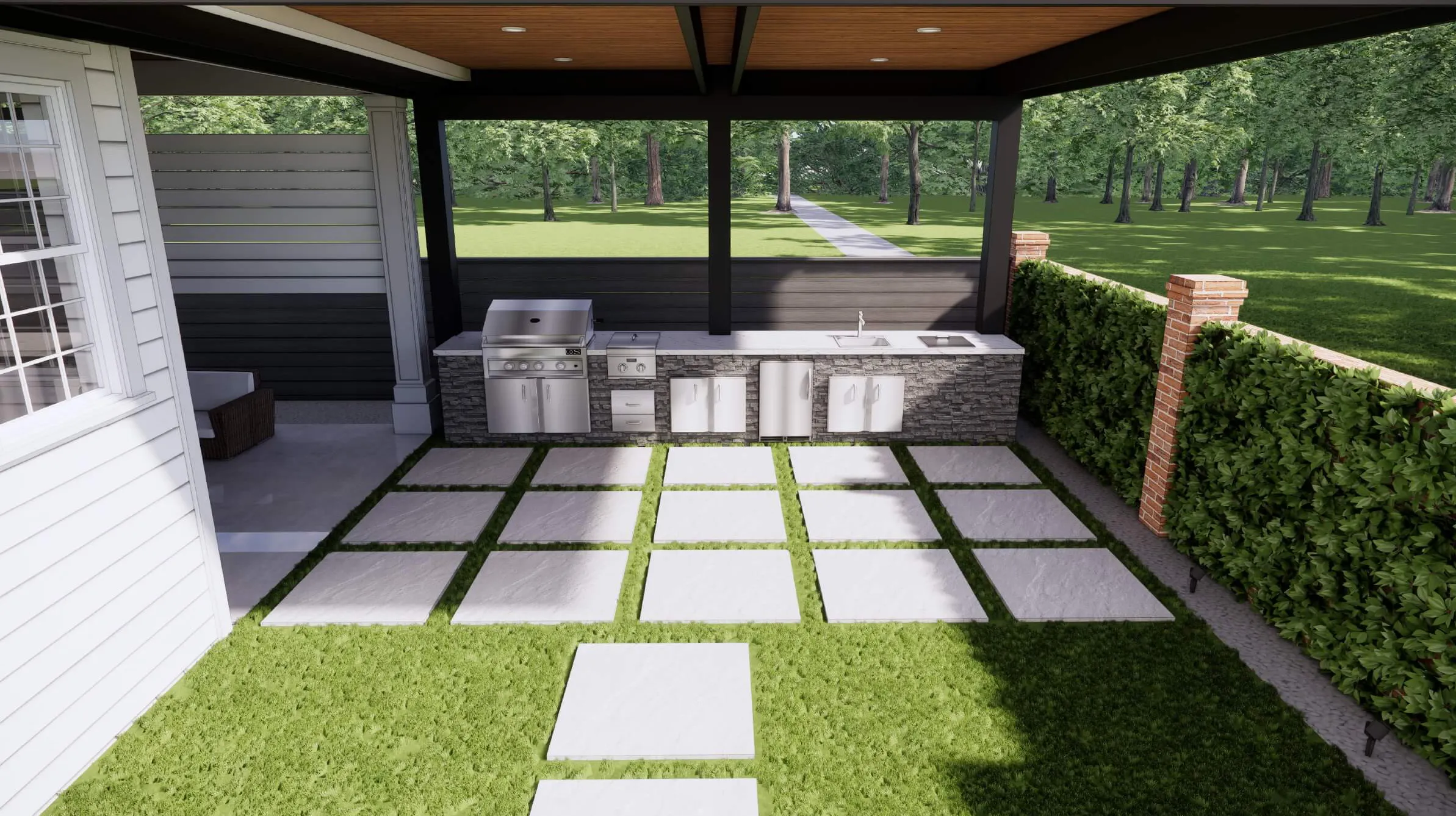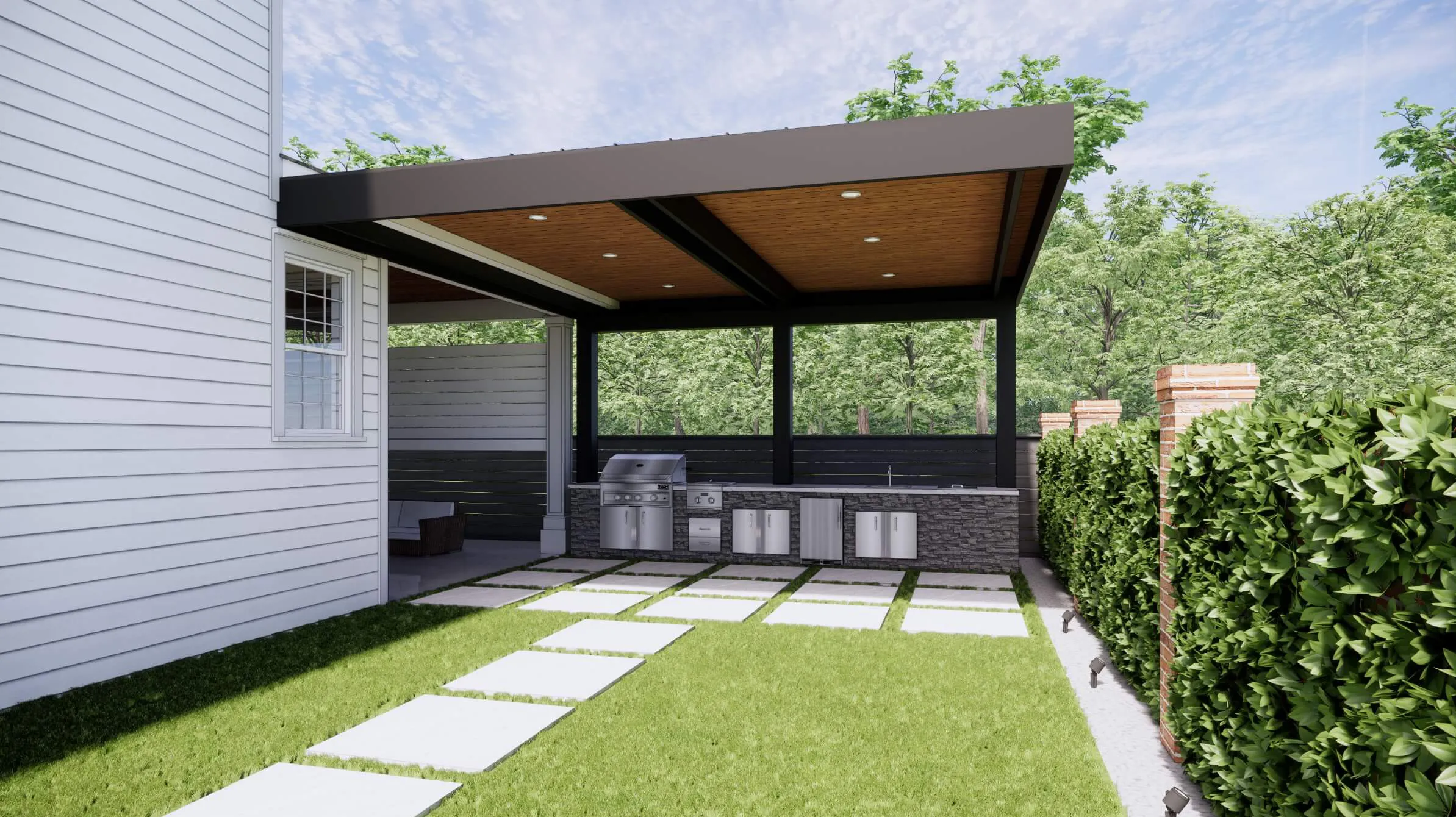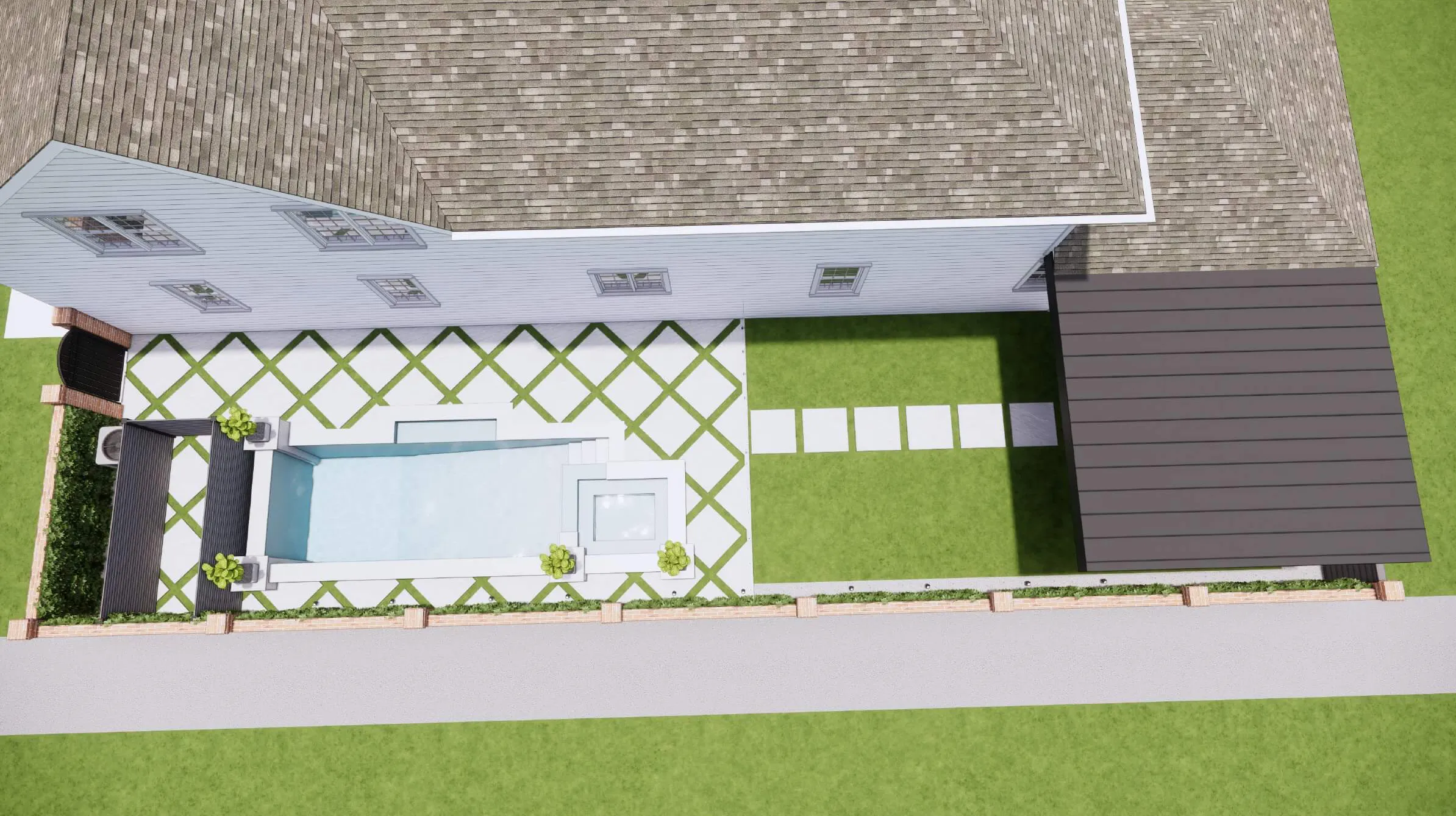 To complete the space, we added a Trex board wall for a TV and soundbar, a large ceiling fan that cools the entire area, and recessed lighting for nighttime enjoyment. The result is a modern, family-friendly backyard designed for entertaining, relaxing, and making the most of poolside living.