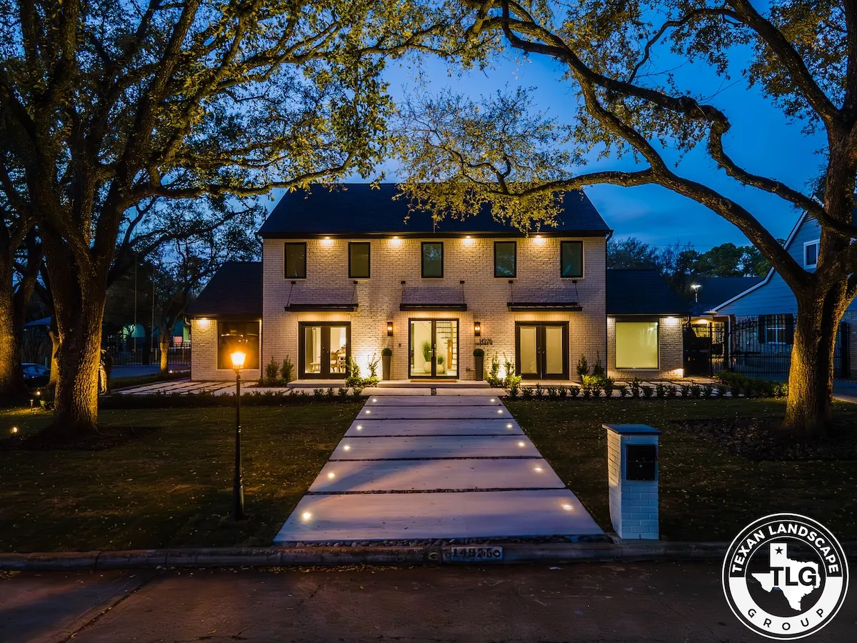 Modern LED landscape lighting casts a warm glow that enhances the beauty of both the home and its surroundings as evening falls. A cluster of majestic live oak trees stands proudly on the grounds, offering ample natural shade and adding a timeless charm to the landscape.