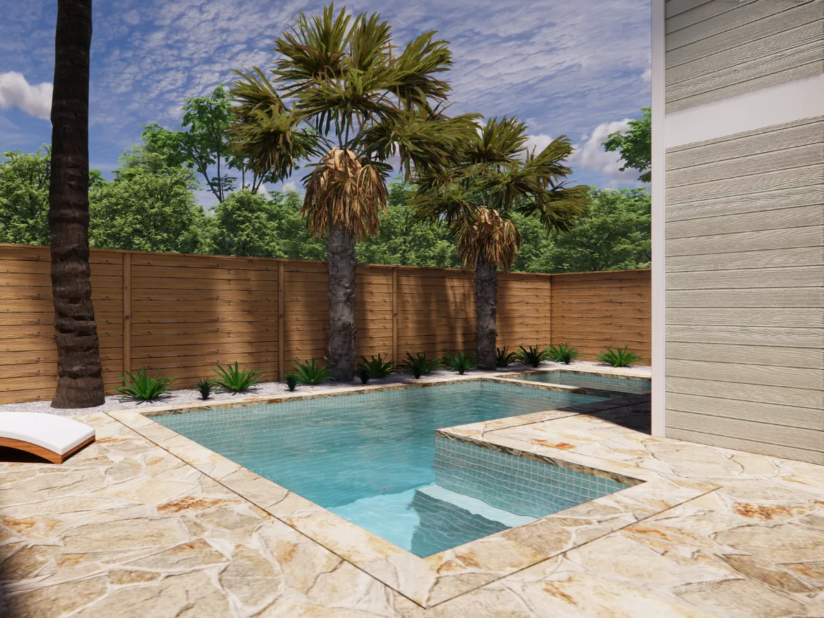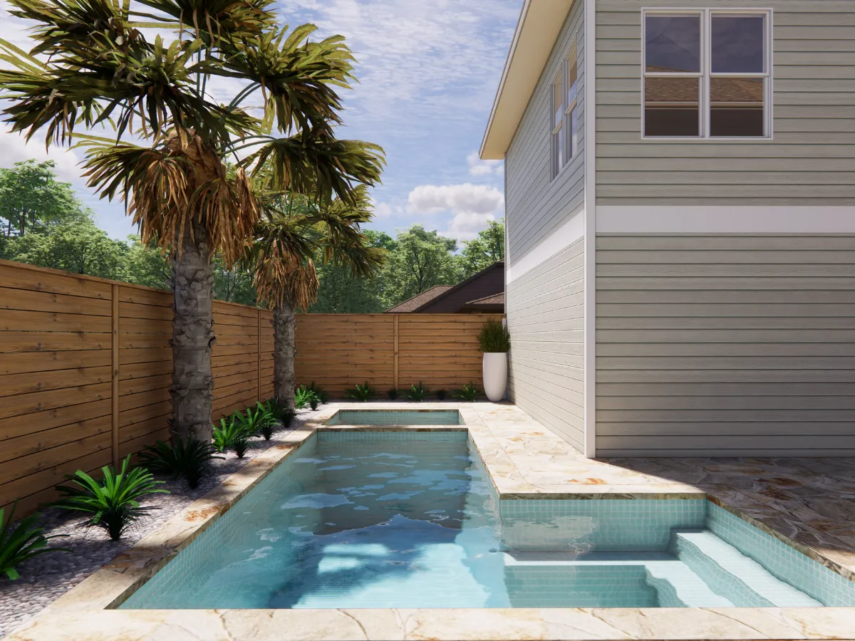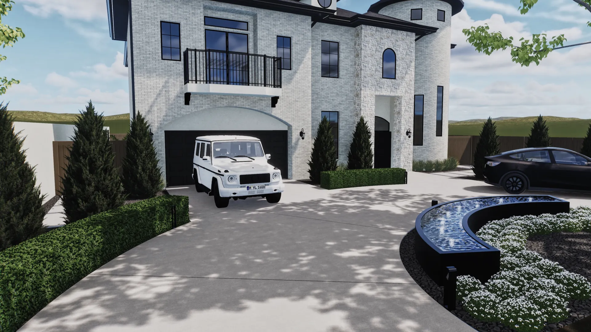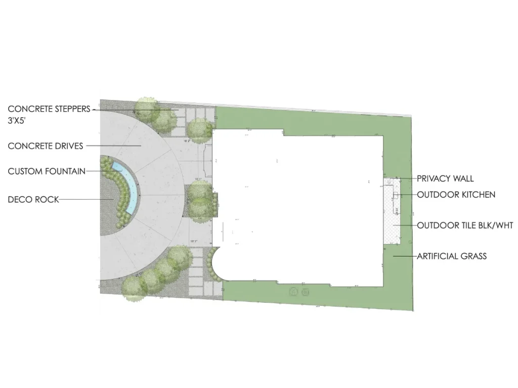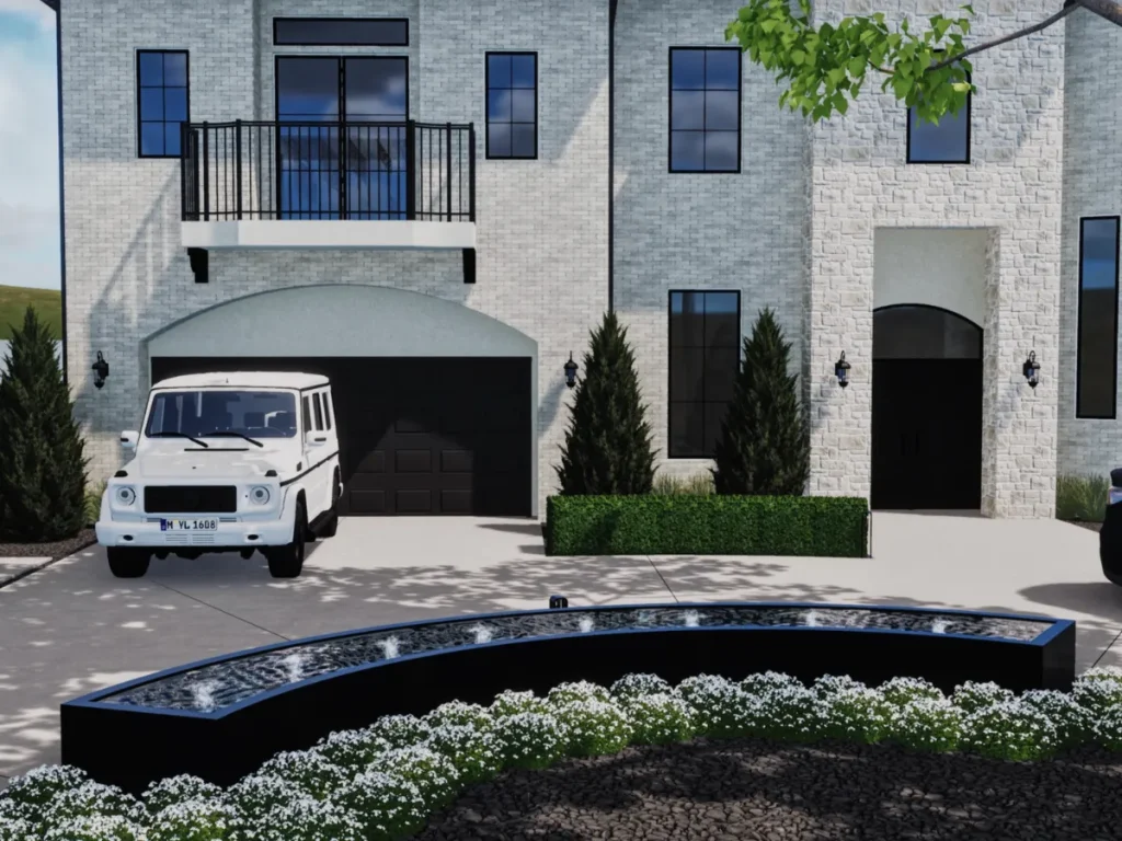 A custom-built water feature is planned near the front entrance to create a calming focal point. The gentle sound of running water will enhance the ambiance and add an element of serenity to the front yard experience.