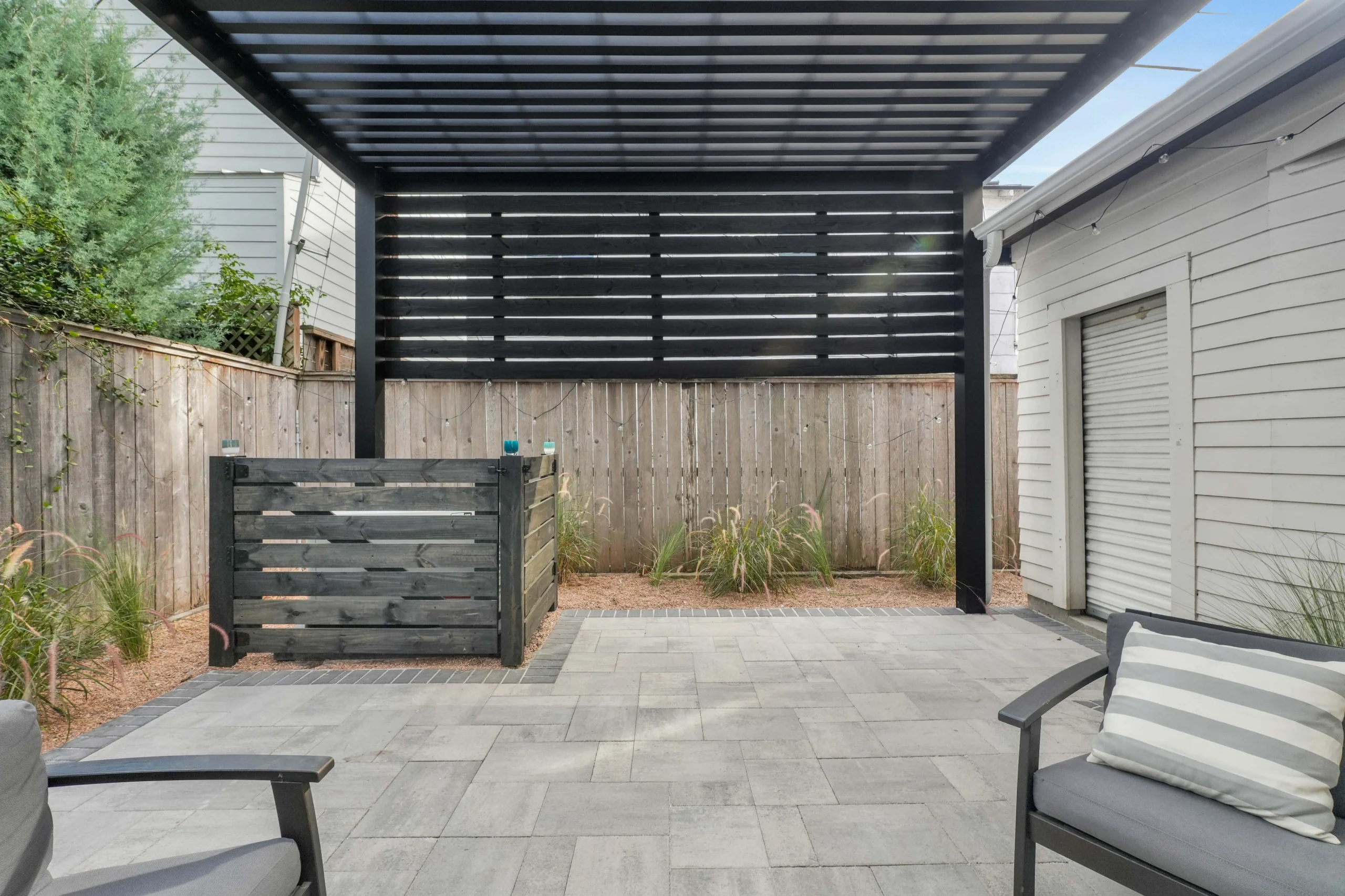 Located in Houston’s Heights neighborhood, this project transforms a compact backyard into a clean, modern outdoor living space. A custom black steel pergola with horizontal slat panels creates a defined lounge area, offering shade, privacy, and a striking architectural focal point.