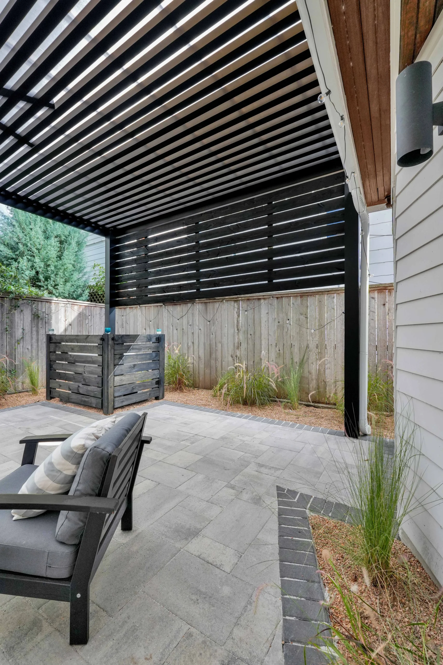 The patio was rebuilt with large-format concrete pavers in a cool gray tone, bordered with dark charcoal brick that adds contrast and a finished edge. A matching slatted enclosure was added to conceal utilities, keeping the layout streamlined and clutter-free.
