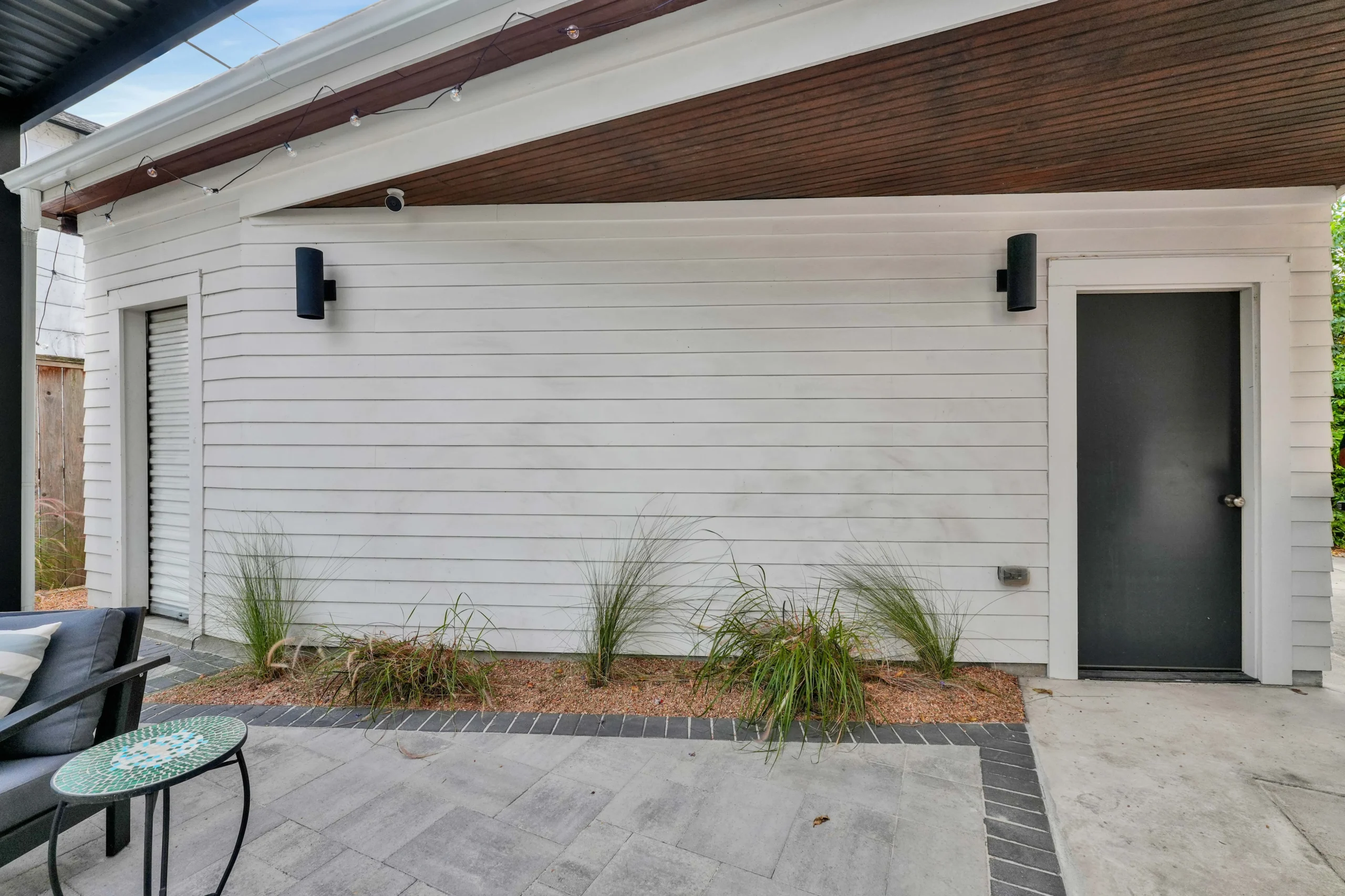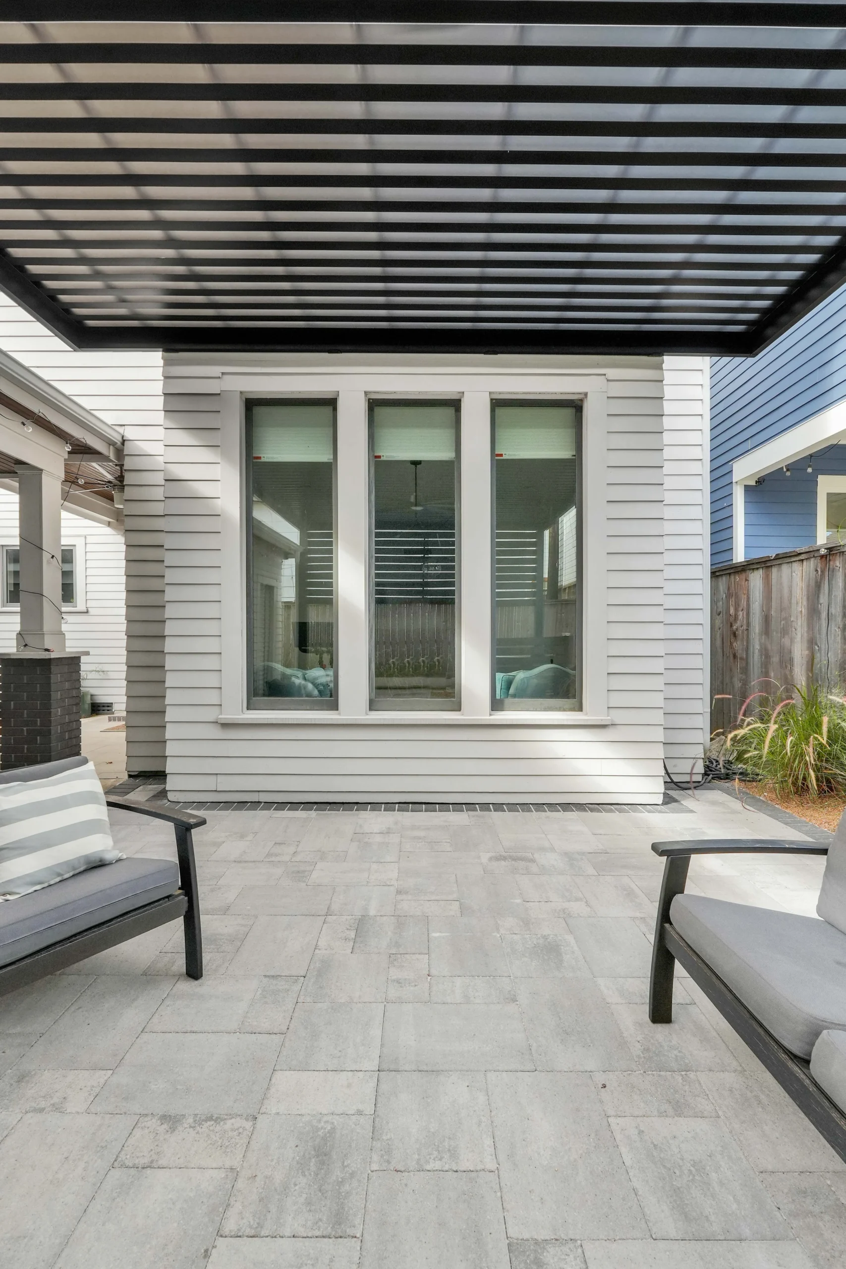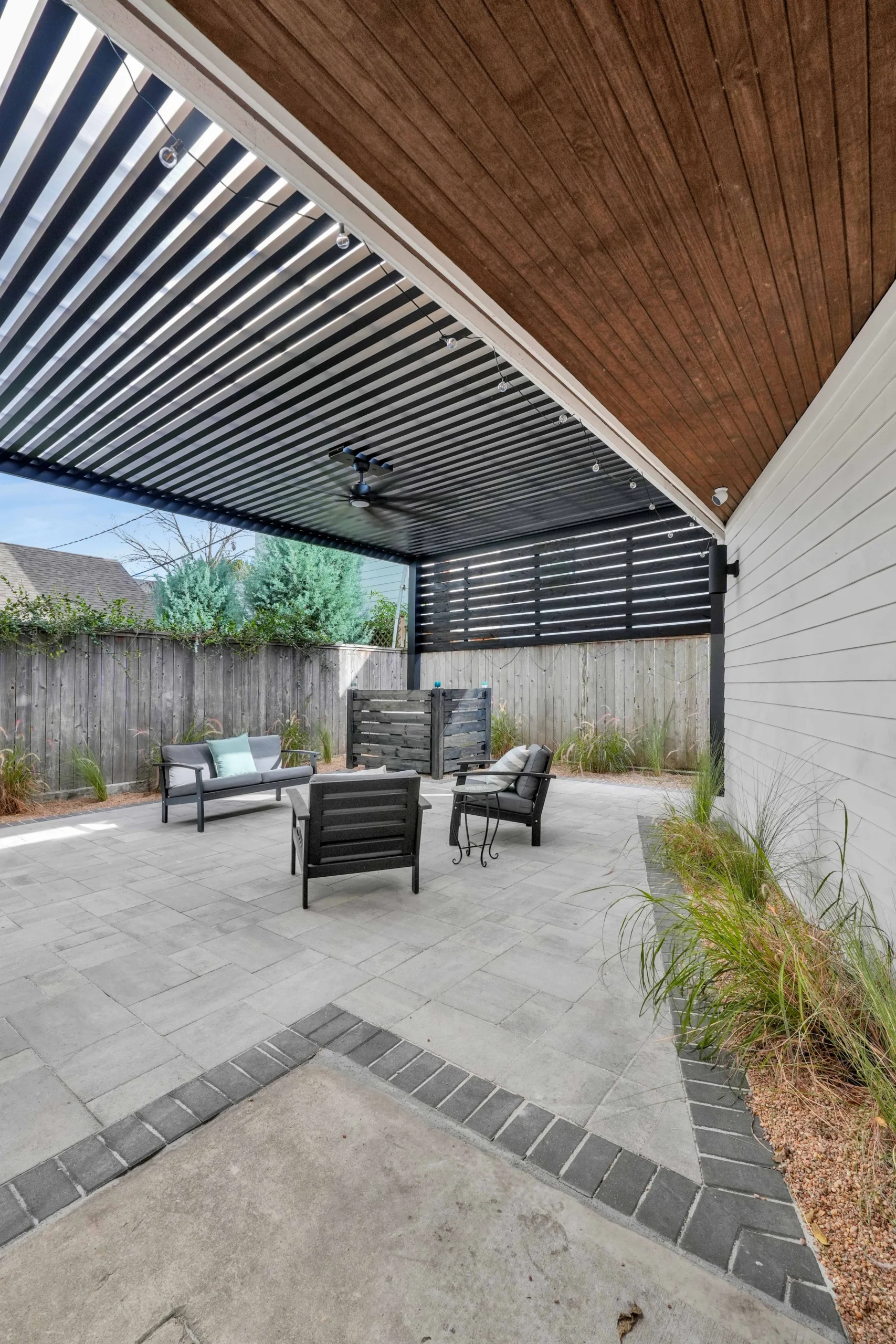 Along the fence line, low-maintenance grasses and textured plantings soften the hardscape and introduce subtle movement and color. Together, the updated structure, refined paver layout, and simple landscape palette create a polished outdoor retreat designed for everyday relaxation and effortless entertaining.