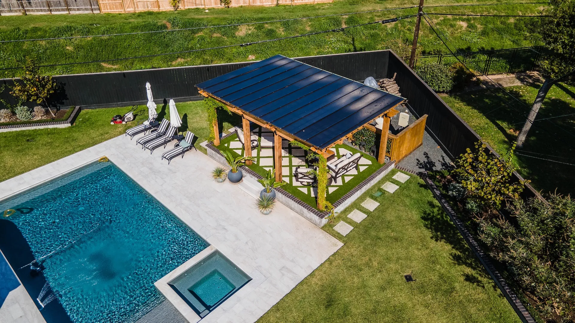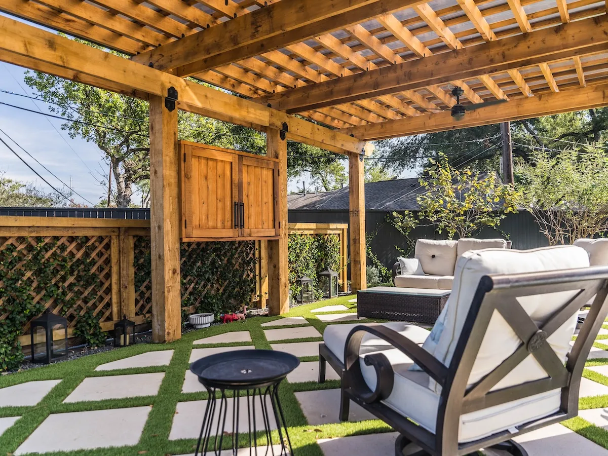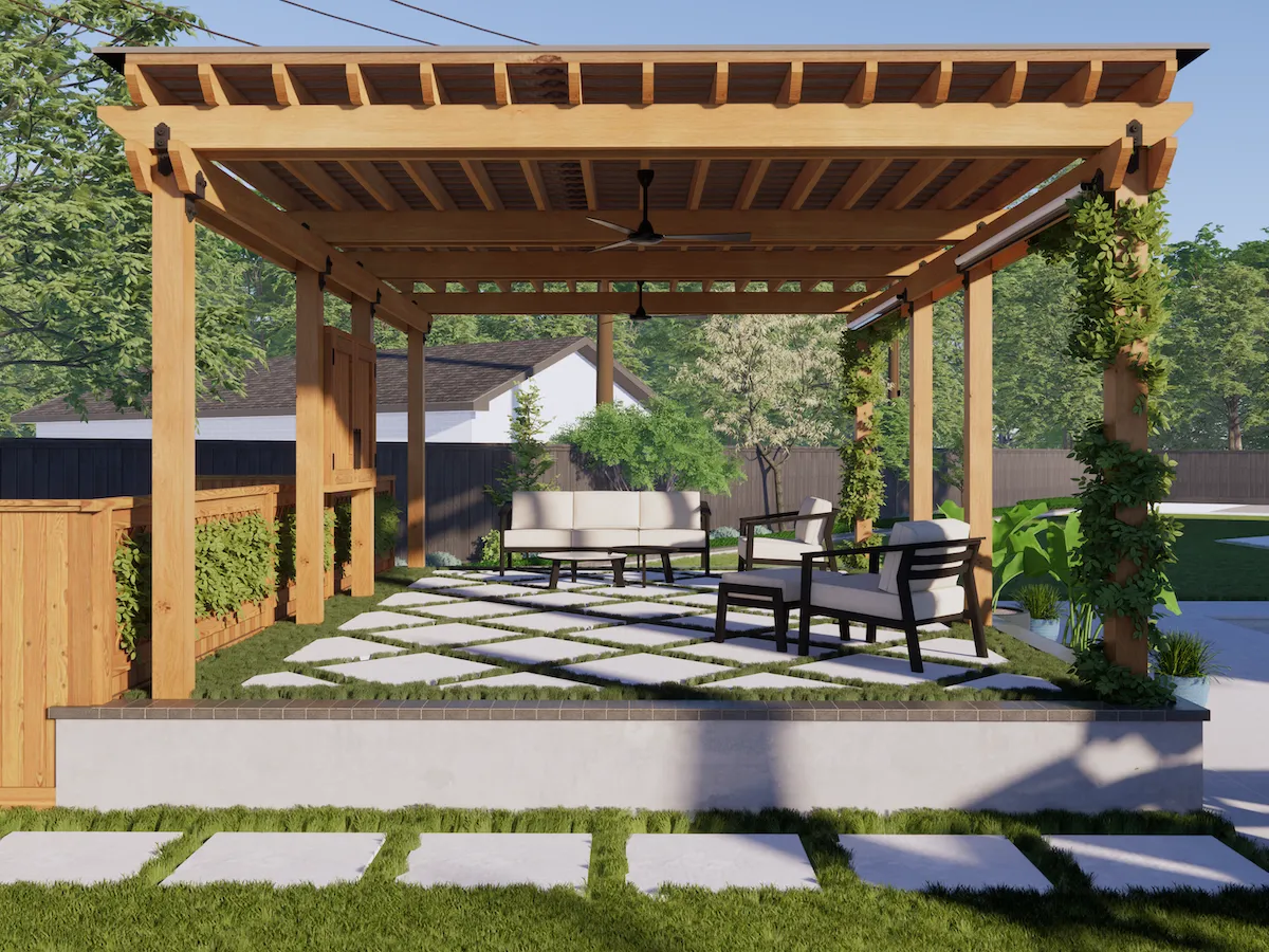To enhance the overall ambiance and comfort of the space, we installed electrical wiring to the pergola, allowing for the addition of two stylish ceiling fans—perfect for providing a refreshing breeze during the sweltering Texas summers.