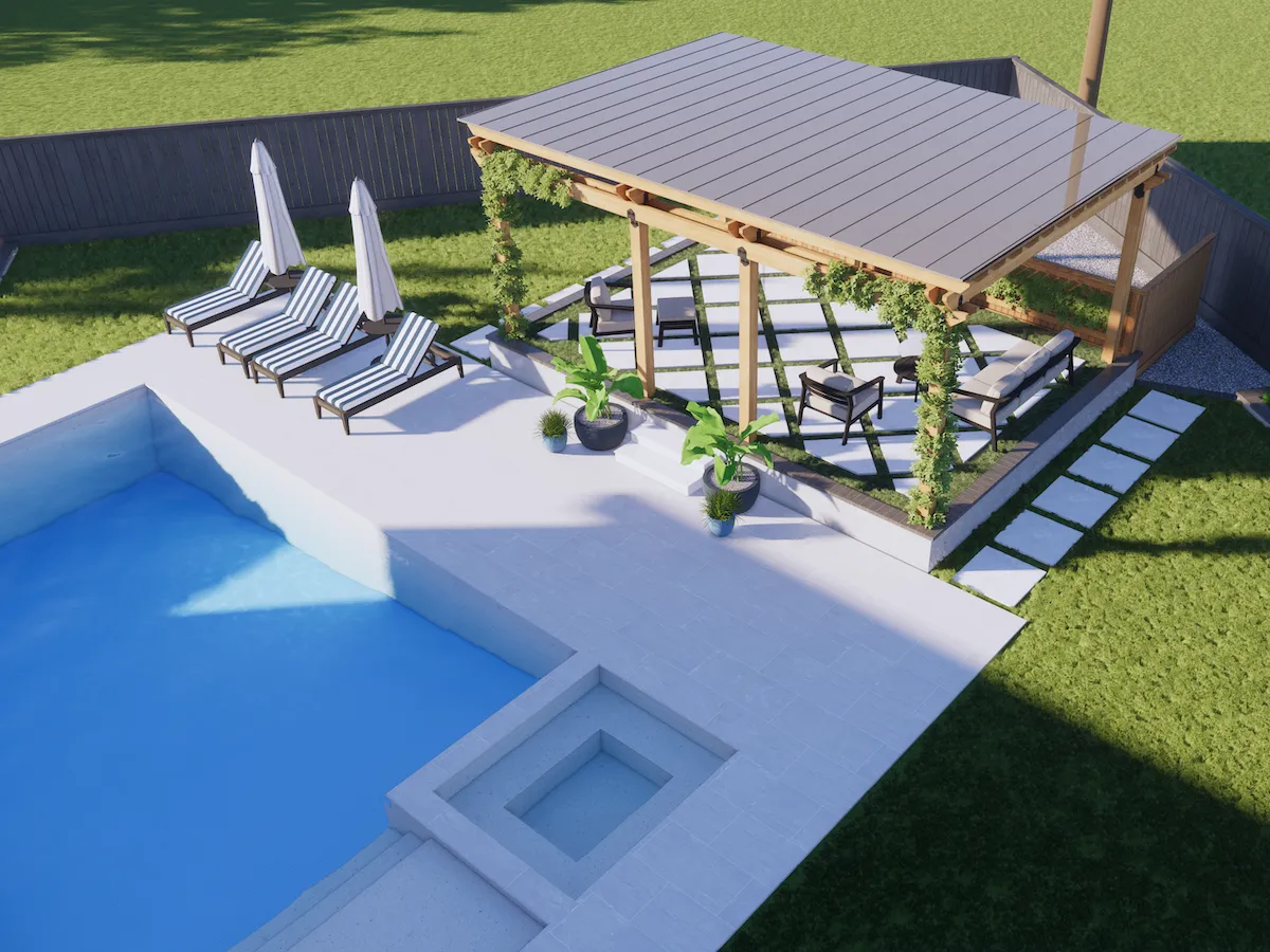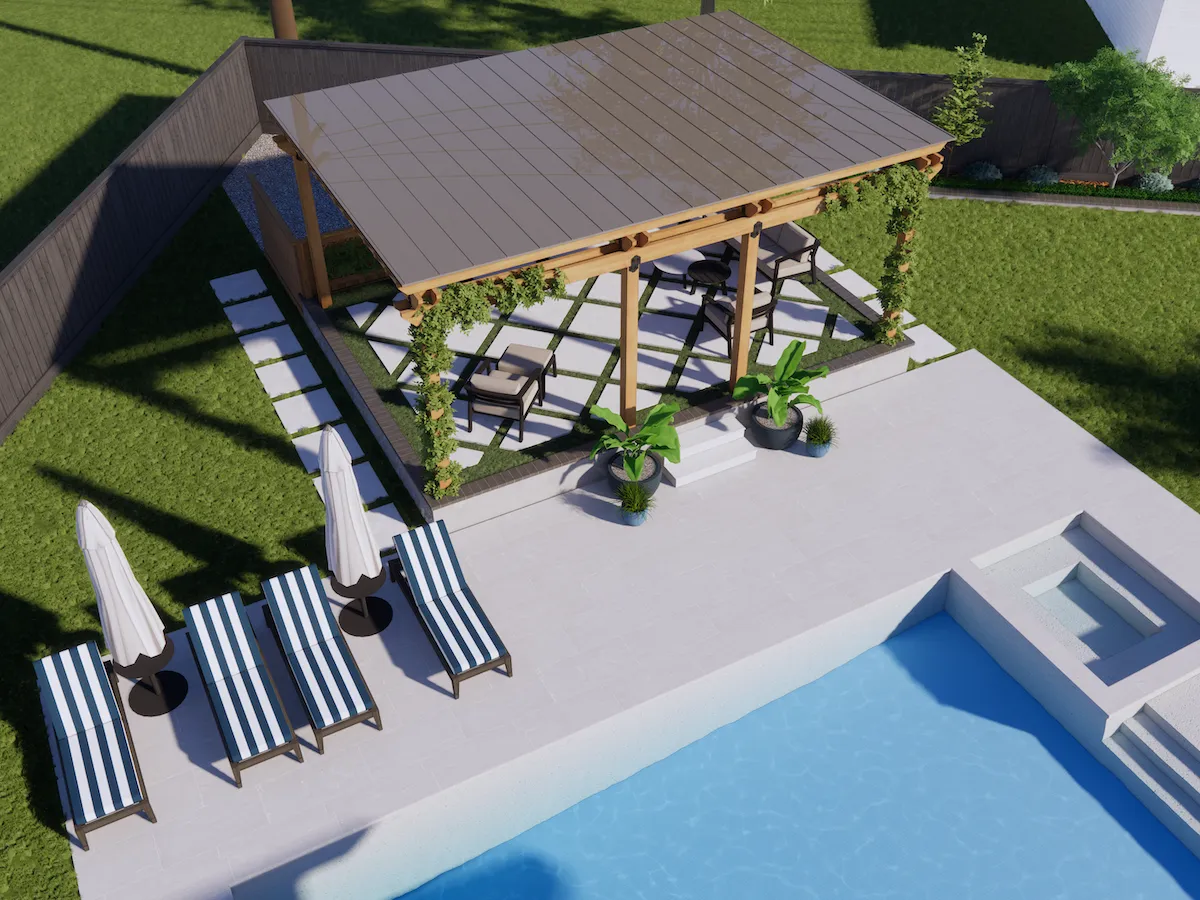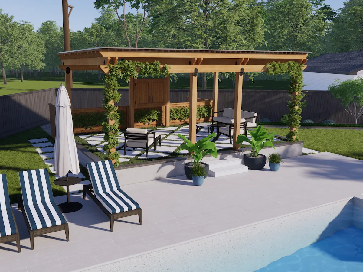 To enhance the overall ambiance and comfort of the space, we installed electrical wiring to the pergola, allowing for the addition of two stylish ceiling fans—perfect for providing a refreshing breeze during the sweltering Texas summers.