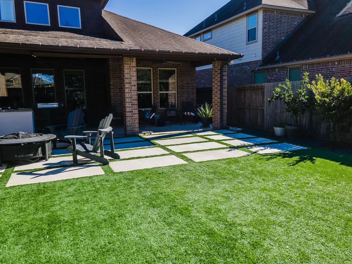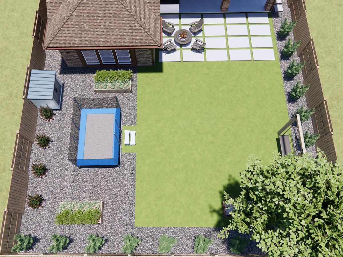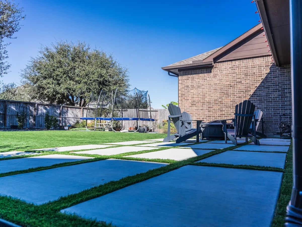 For the walkway, we incorporated 2×2 concrete pavers paired with Blackstar gravel, creating a cohesive yet distinct zone within the backyard. Between the pavers, we added lush spring turf, enhancing both the visual appeal and usability of the space. In total, the project spanned approximately 1,300 to 1,400 square feet of artificial turf and usable space.