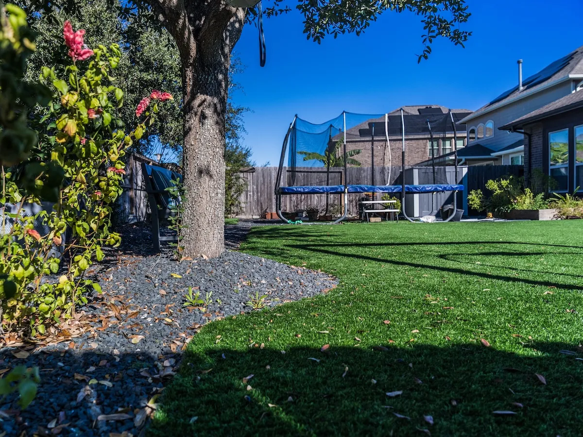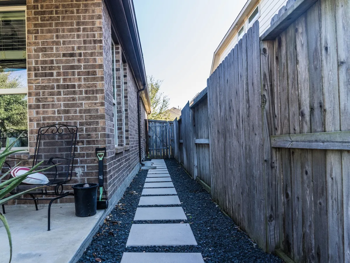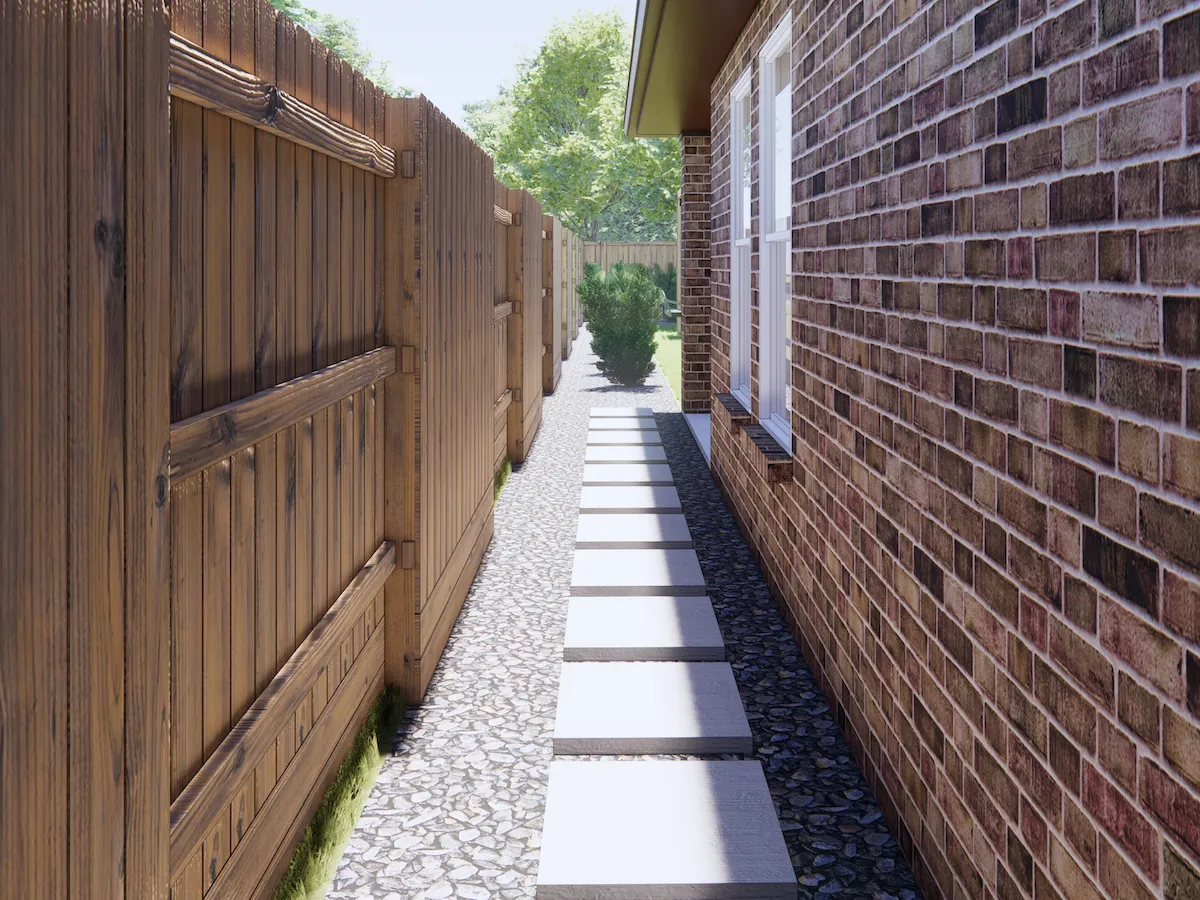 For the walkway, we incorporated 2×2 concrete pavers paired with Blackstar gravel, creating a cohesive yet distinct zone within the backyard. Between the pavers, we added lush spring turf, enhancing both the visual appeal and usability of the space. In total, the project spanned approximately 1,300 to 1,400 square feet of artificial turf and usable space.