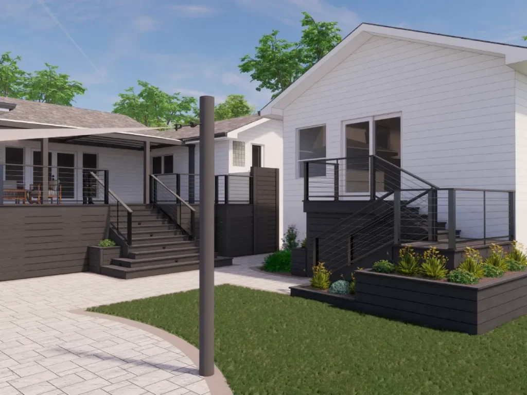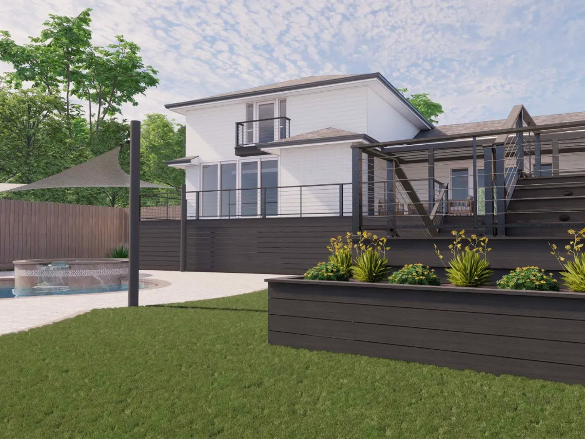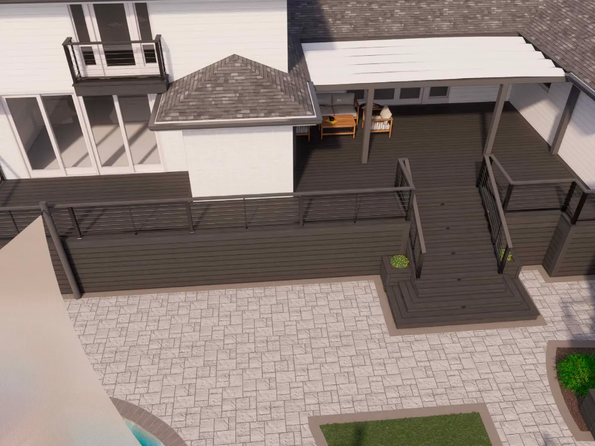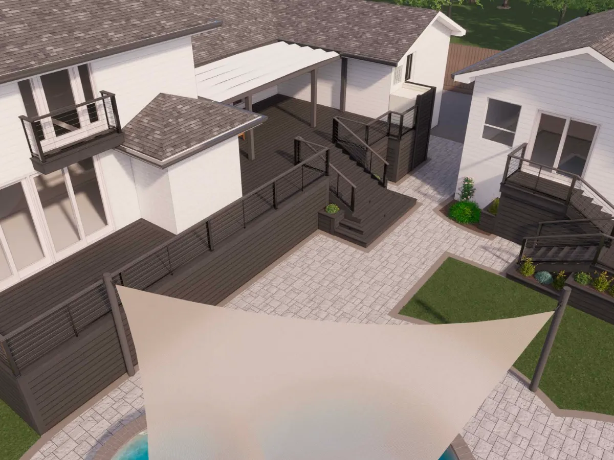 The existing pool area was upgraded with modern pavers, bringing a sleek, refreshed look to the deck while providing a durable, slip-resistant surface. We designed a modern deck with clean lines and minimalist railings for the main home and in-law suite, creating a unified, elevated look that ties the entire outdoor space together.
