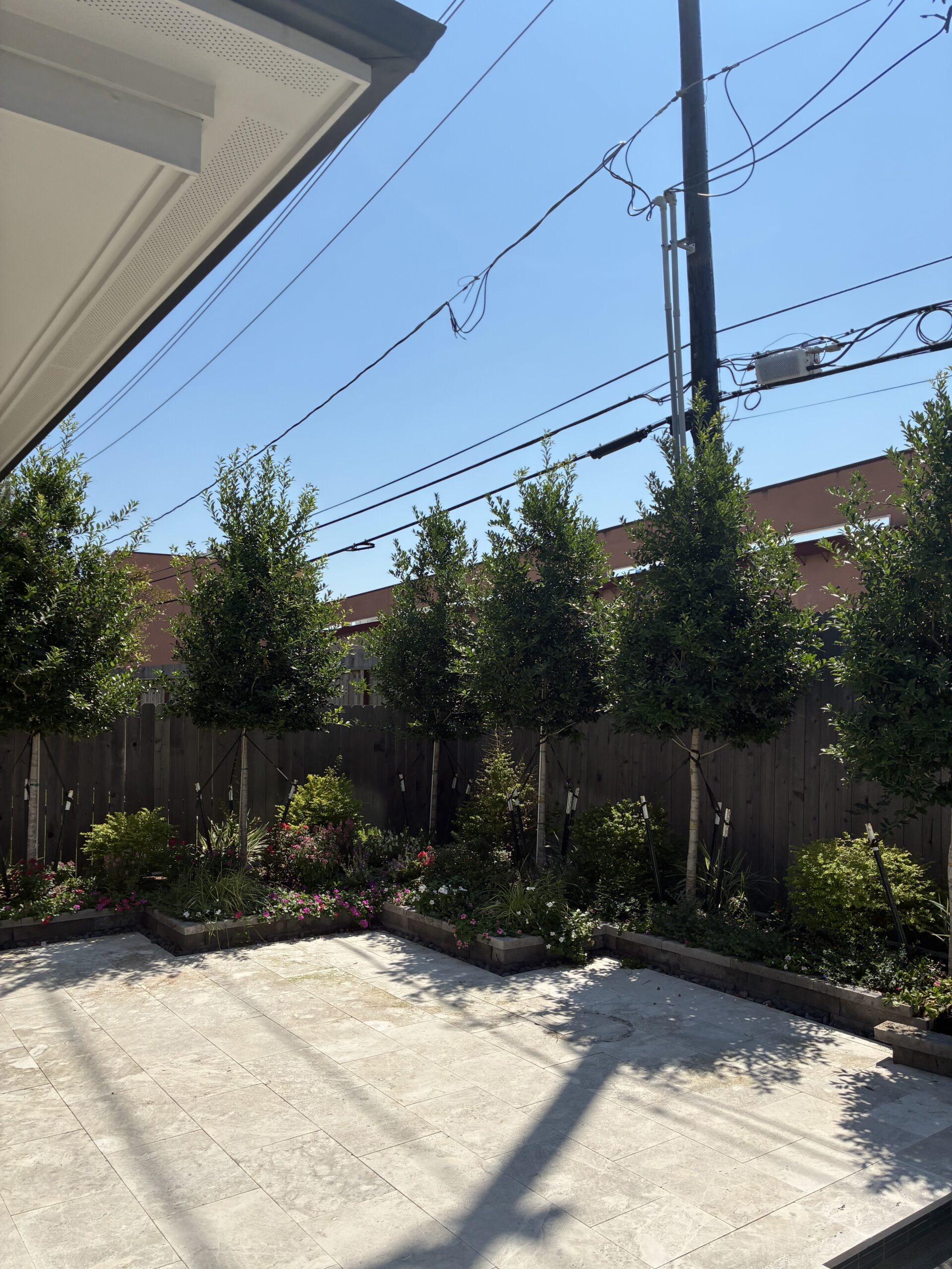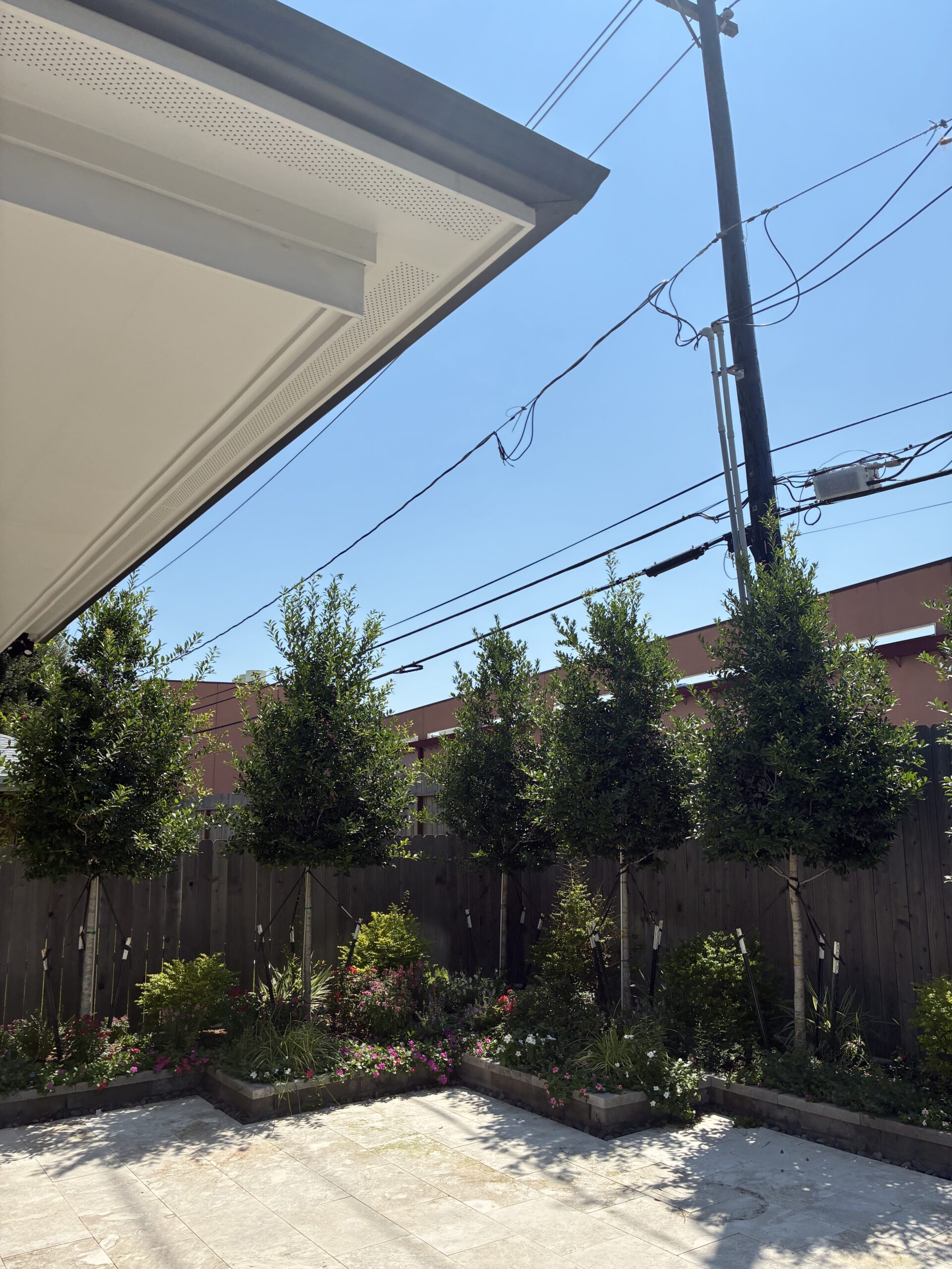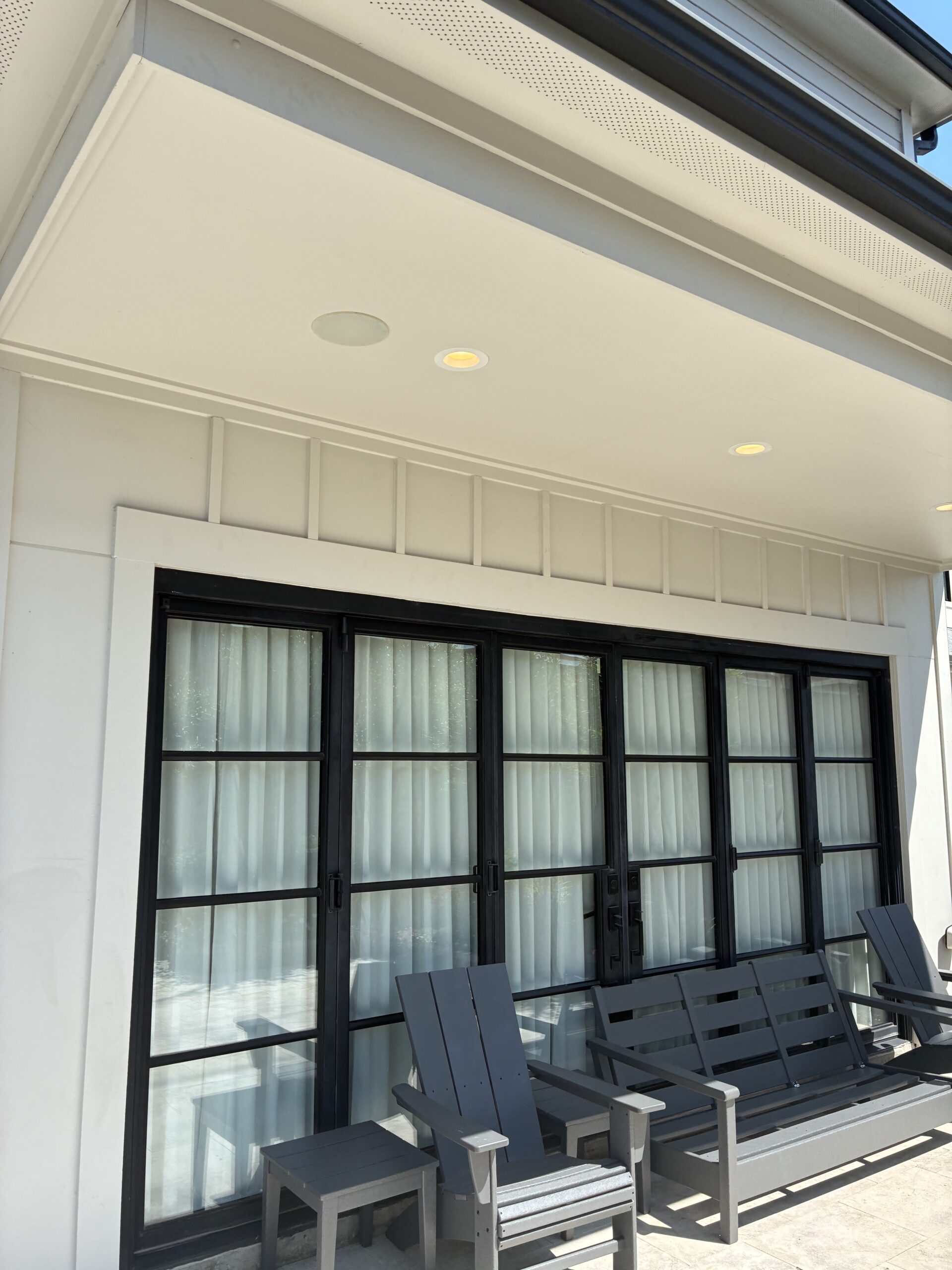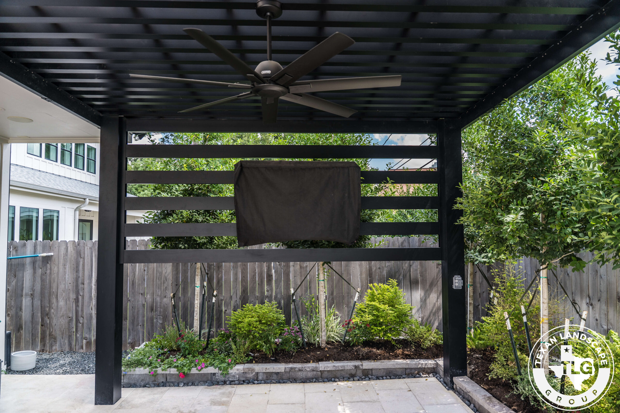 We designed and built a channel lattice pergola with bronze Hercules panels, spaced every eight inches to filter UV rays while still allowing sunlight to pass through. The result is a comfortable shaded retreat that feels 10–15° cooler while preserving brightness indoors. To enhance comfort and usability, we installed a ceiling fan with a dedicated switch, as well as a lattice privacy screen along the back. This not only blocks views of the nearby commercial building but also created the perfect place to mount a TV, turning the patio into a functional entertainment space.