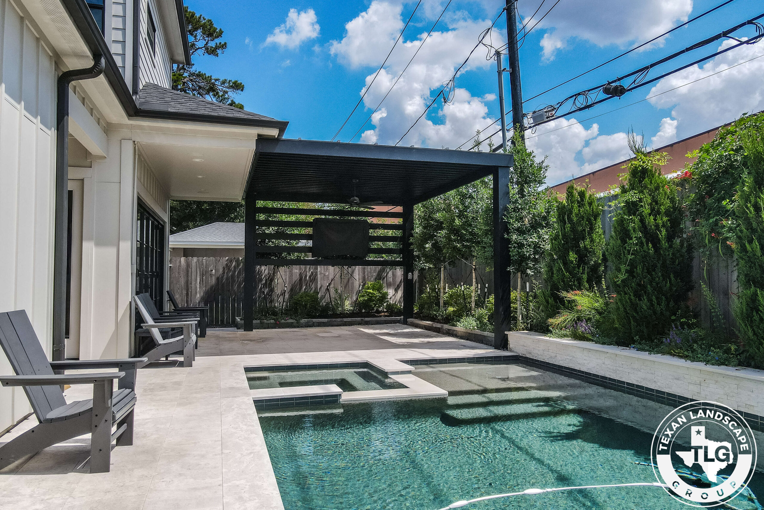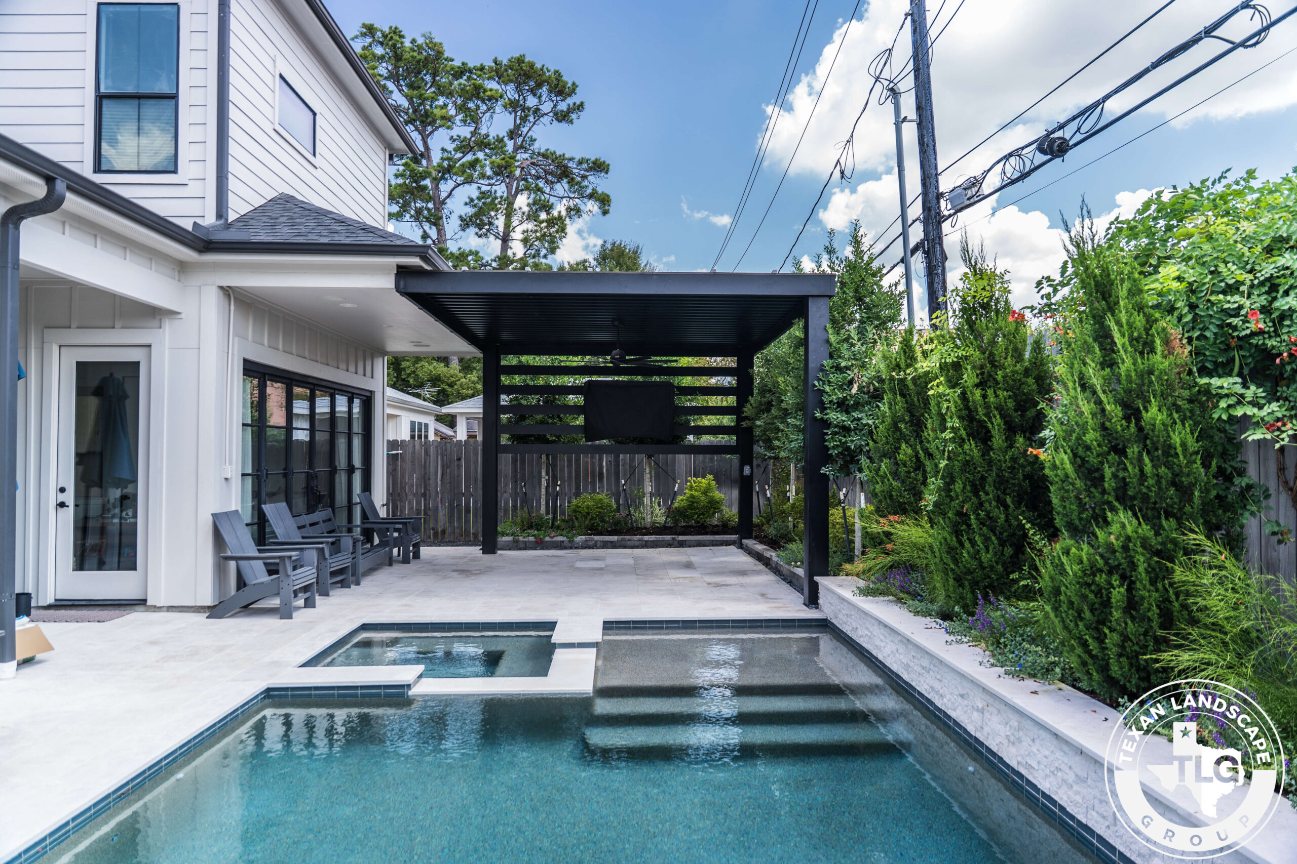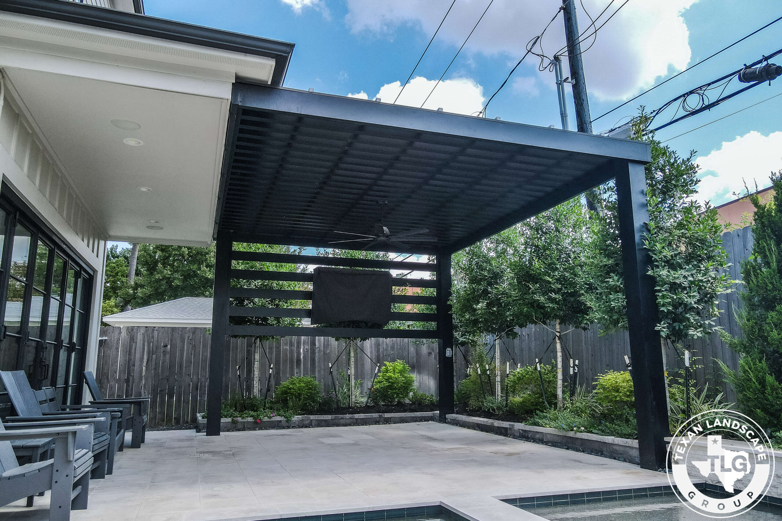 This backyard renovation in Houston, Texas, was designed to provide the homeowners with much-needed shade and privacy while maintaining natural light in their main living area. The original patio reflected so much sunlight that it felt overwhelming, especially after time spent at the pool. Our goal was to create a structure that offered relief from the sun without blocking views or darkening the interior of the home.