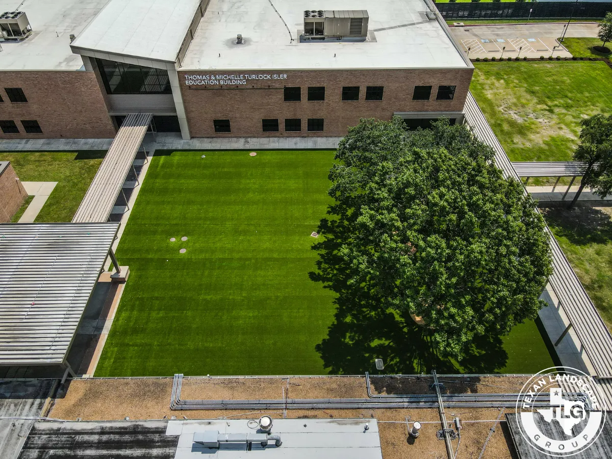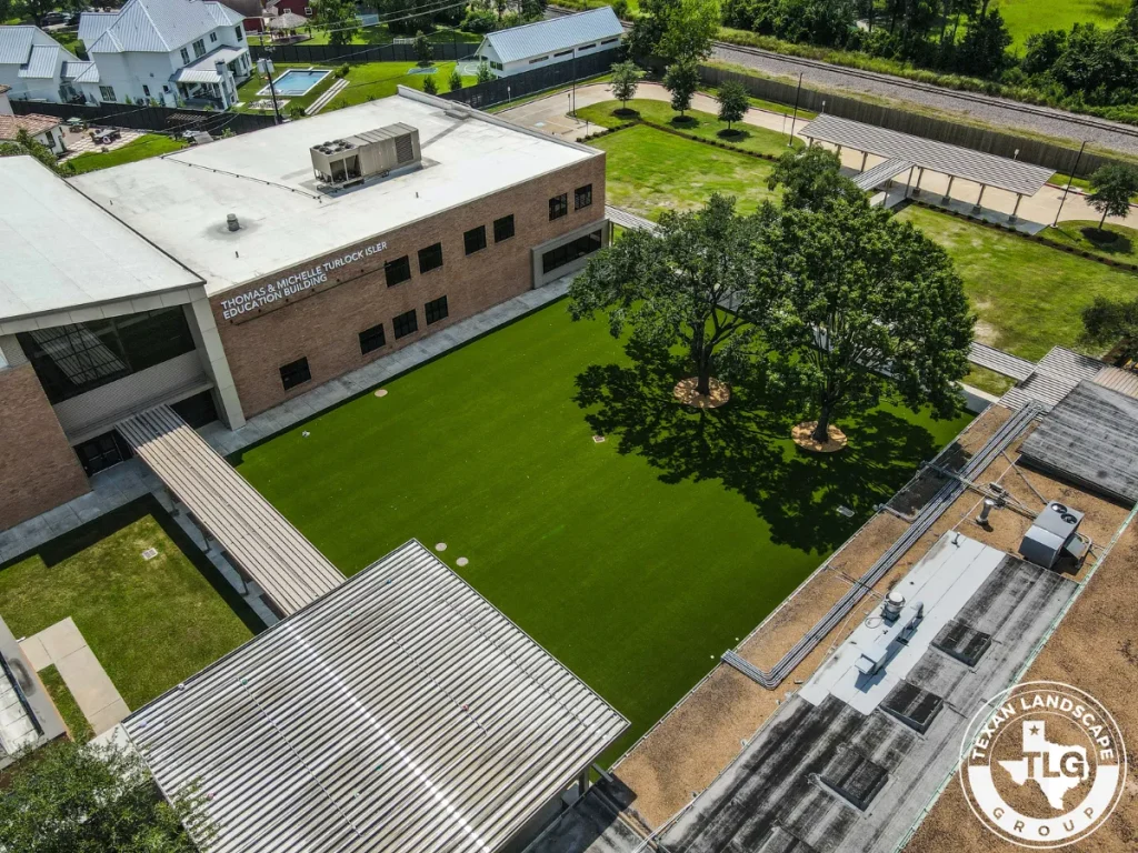 Texan Landscape Group installed over 12,000 square feet of premium synthetic turf, transforming the school’s field into a vibrant, low-maintenance surface perfect for daily activities and school events. The turf selected offers a soft, realistic feel underfoot while holding up to high foot traffic and Houston’s changing weather conditions.