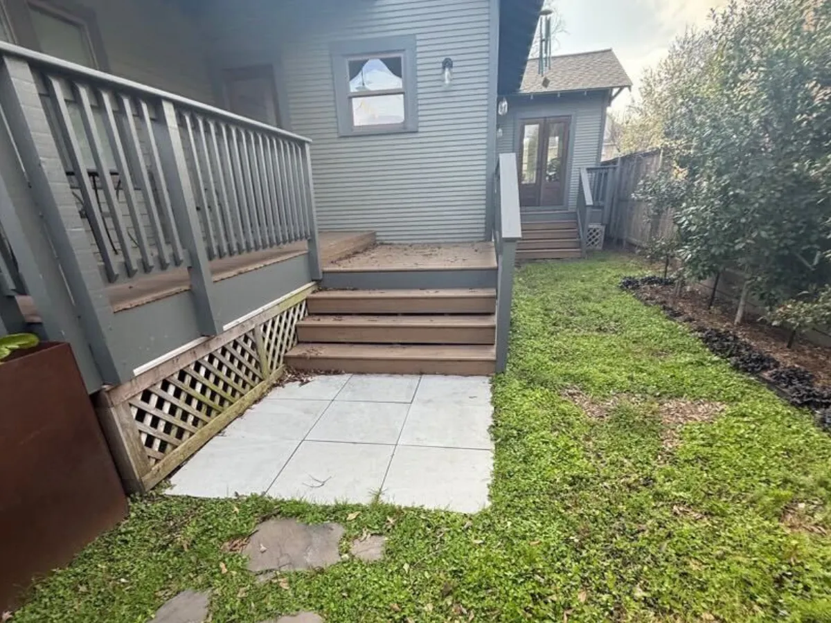 The first patio measures 7×7 and is made from Scandina Gray pavers, offering a cozy landing space. The larger patio serves as the main gathering area. This modern, streamlined transformation combines style with function, creating a polished outdoor space ready for everyday use.