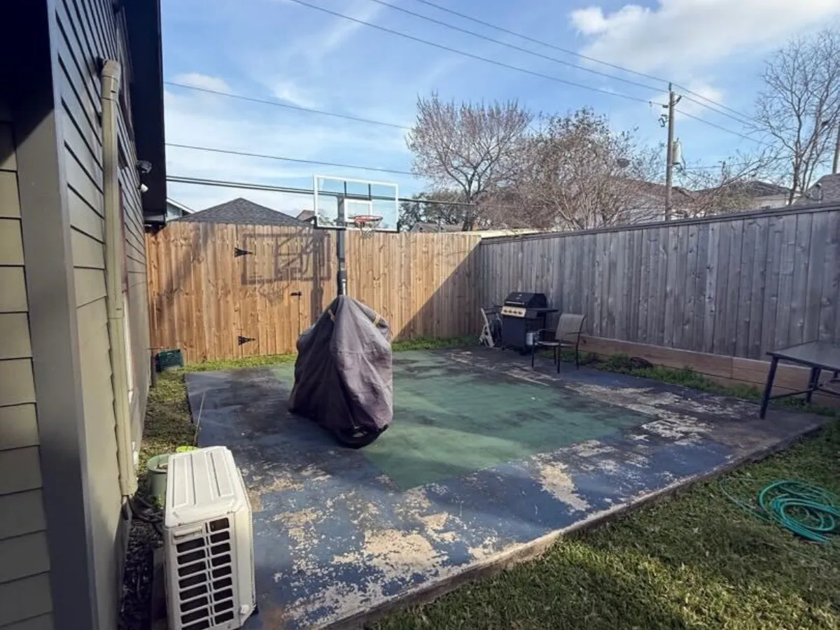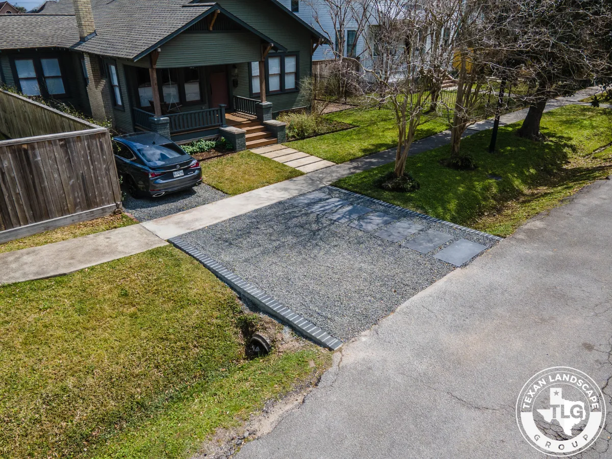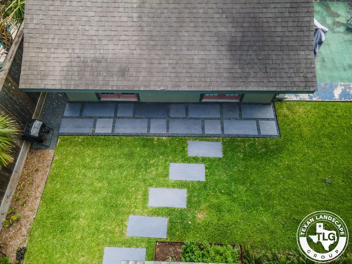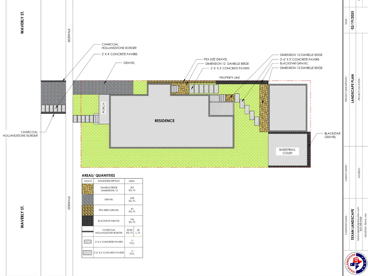 In the backyard, we framed the basketball court with a Black Star gravel border, preparing the area for future expansion. The space features a contemporary staggered paver layout, which blends seamlessly with the front yard design. To enhance usability, we graded the yard, installed fresh St. Augustine sod, and added stepping-stone pathways leading to two distinct patio areas.