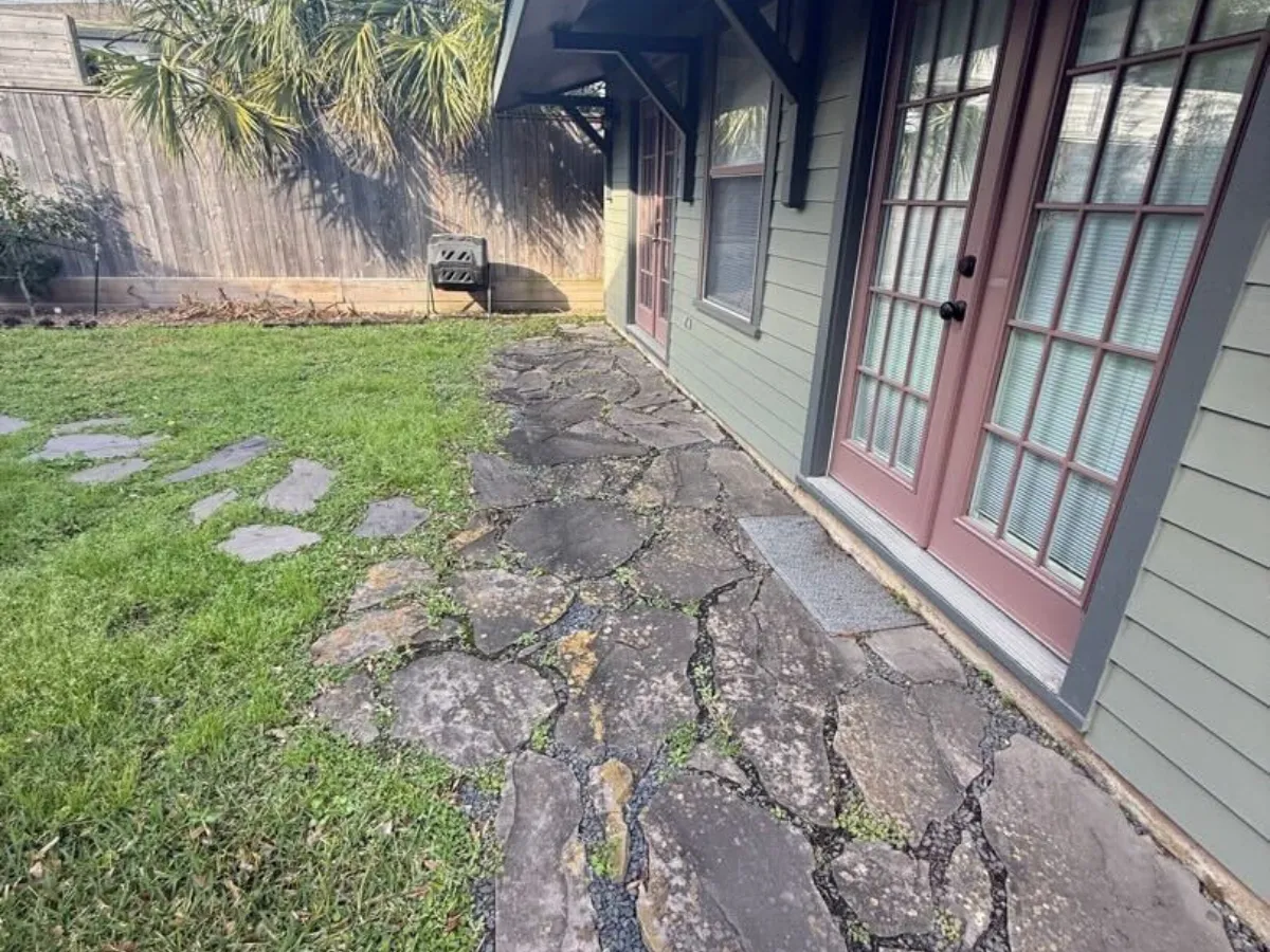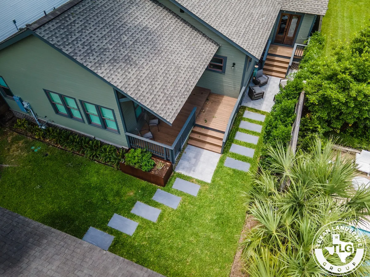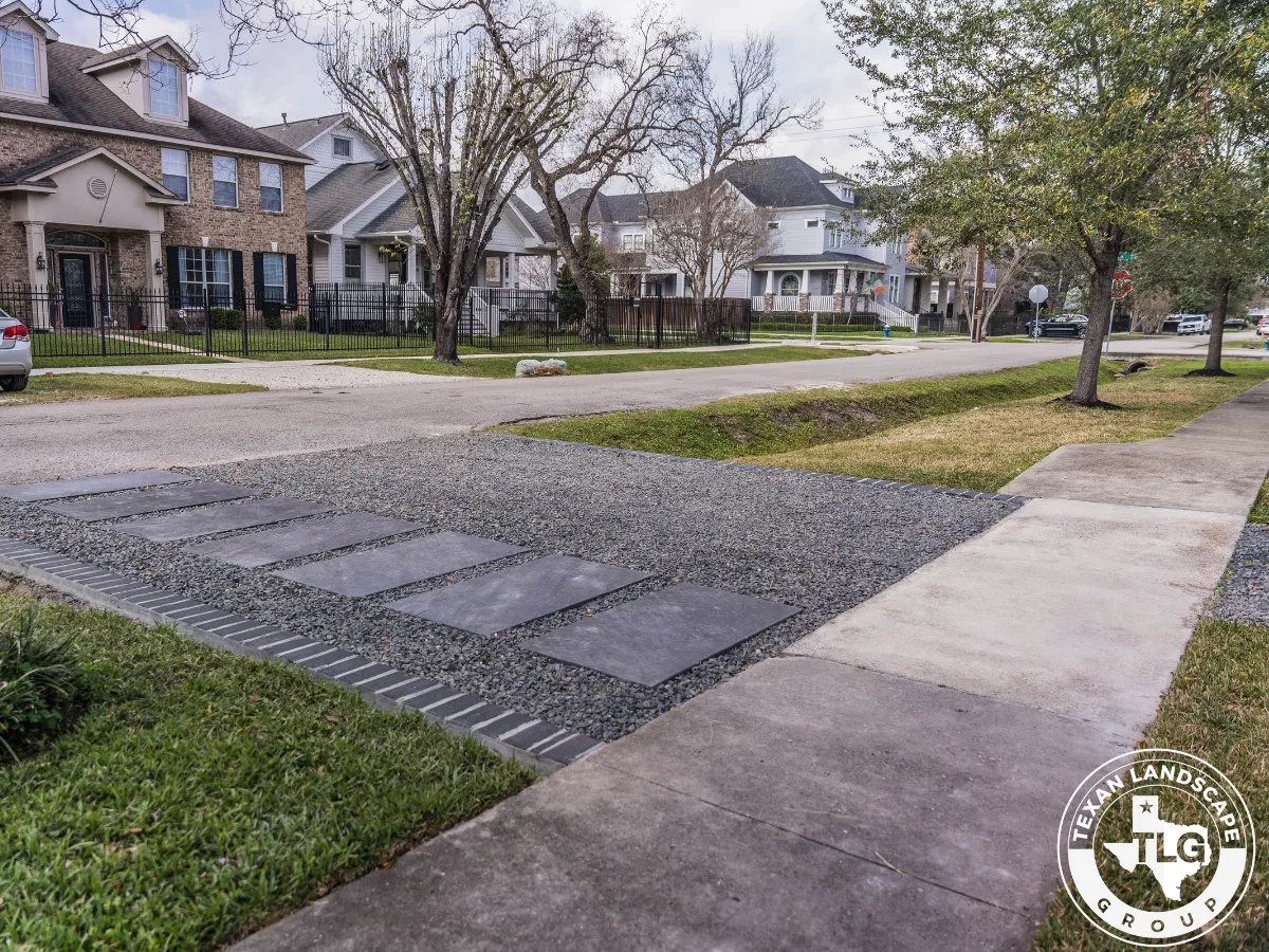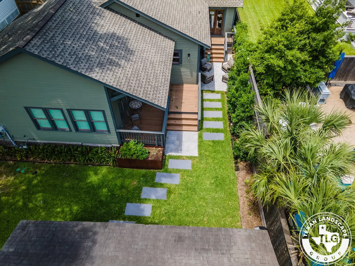 In the backyard, we framed the basketball court with a Black Star gravel border, preparing the area for future expansion. The space features a contemporary staggered paver layout, which blends seamlessly with the front yard design. To enhance usability, we graded the yard, installed fresh St. Augustine sod, and added stepping-stone pathways leading to two distinct patio areas.