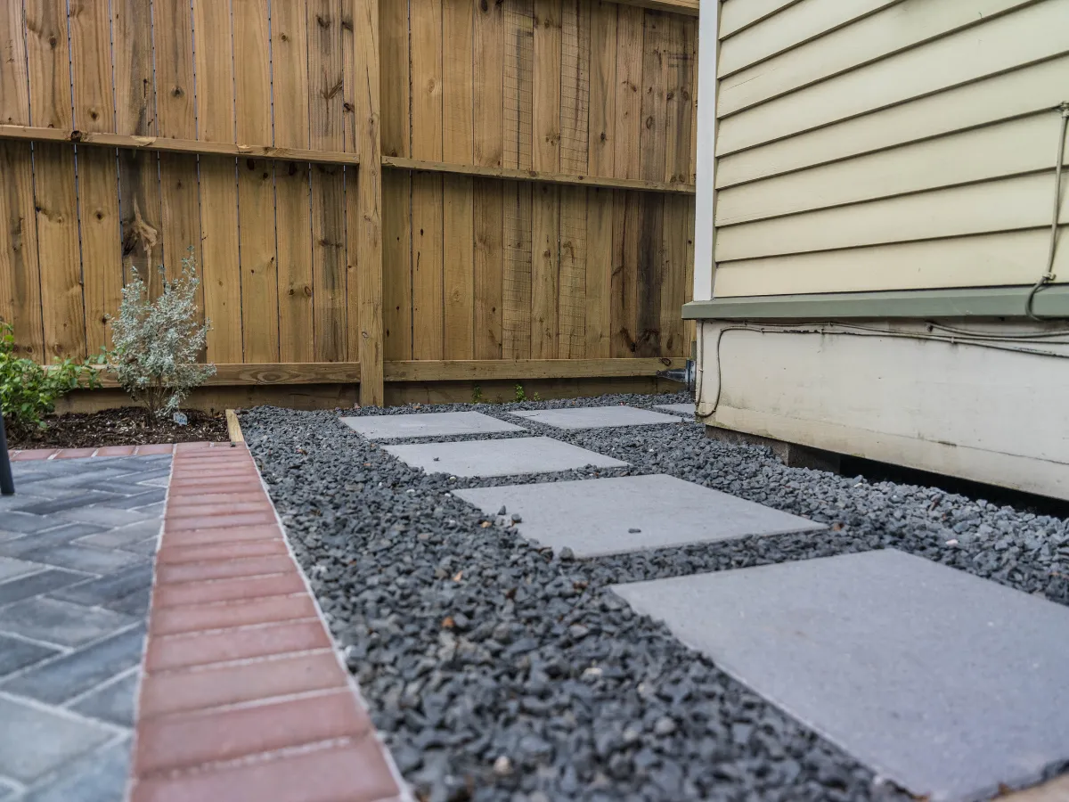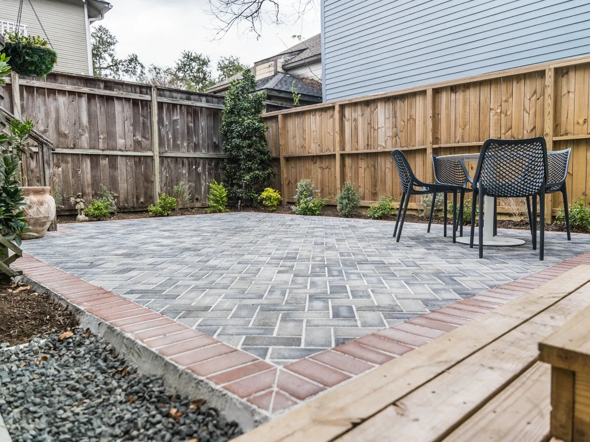 This new backyard begins with a pathway laid with Blackstar gravel, which guides you to the centerpiece of the landscape—the large patio area. Here, Belgard pavers are arranged in a herringbone pattern, surrounded by a constrasting border that accentuates the patio perfectly.